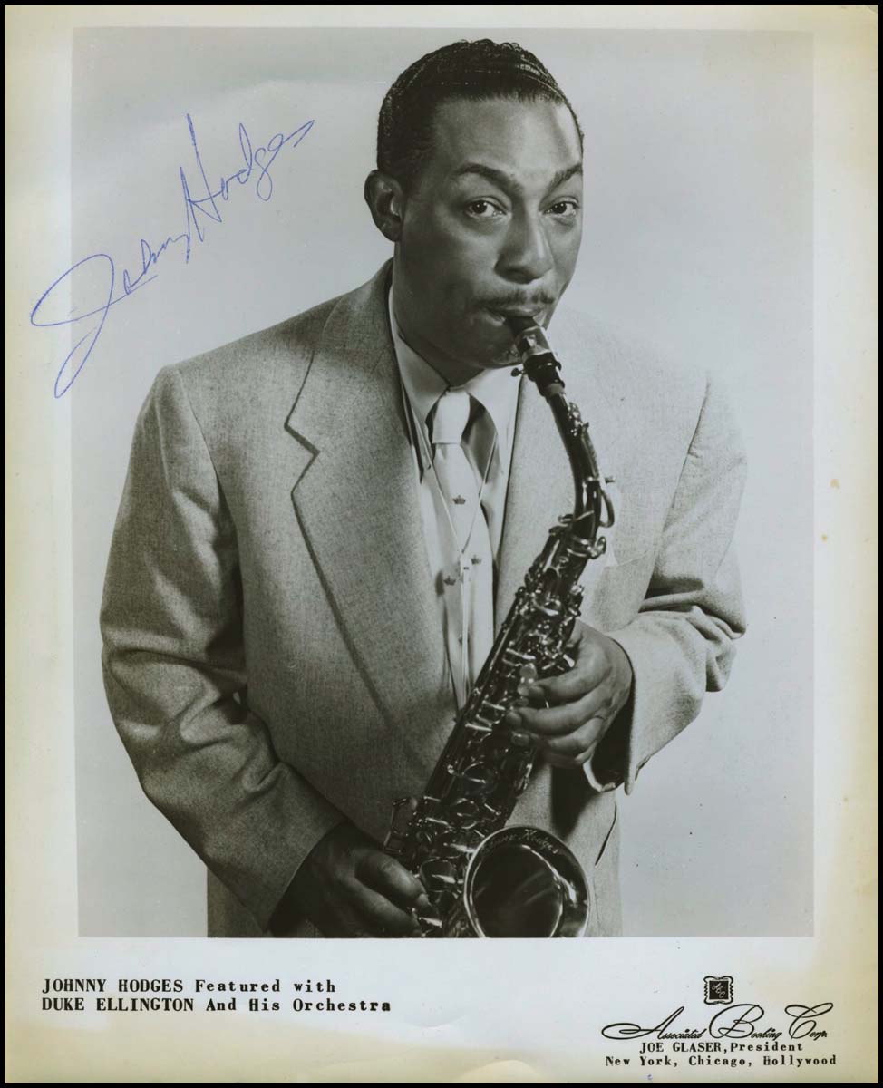 Signed 8 x 10 inch publicity photograph photograph of the longtime alto saxophonist with Duke Ellington's band - one of the greats! Moderate toning and creases to margins, else fine. Signed simply "Johnny Hodges" in blue ballpoint pen.