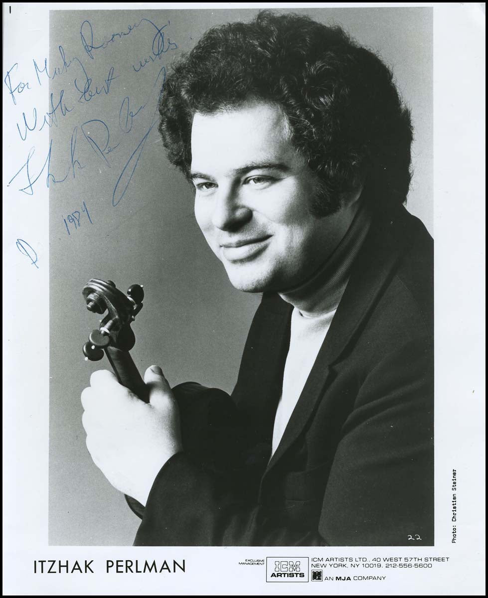 Signed 8 x 10 inch glossy ICM Artists photograph of the supreme Israeli-American violinist, inscribed to the late celebrated actor "For Mickey Rooney with best wishes / Itzhak Perlman / D. 1984." Fine. An unsual association!