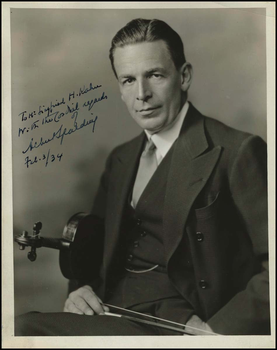 Spalding, Albert. (1888-1953). Signed Photograph. Signed doubleweight 8 x 10 inch photograph of the great violinist whose courtroom premiere of the Barber Concerto is the stuff of legend! He also gave the American premiers of the Elgar and Dohnanyi concerti and wrote a terrific autobiography. Signed and inscribed boldly in black ink "To Siegfried H. Kahn With the Cordial regards of Albert Spalding. Feb. 3/34." Fine.
