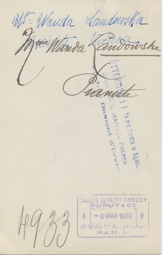 Landowska, Wanda. (1879–1959) Signed Photograph to Roque Spatolo