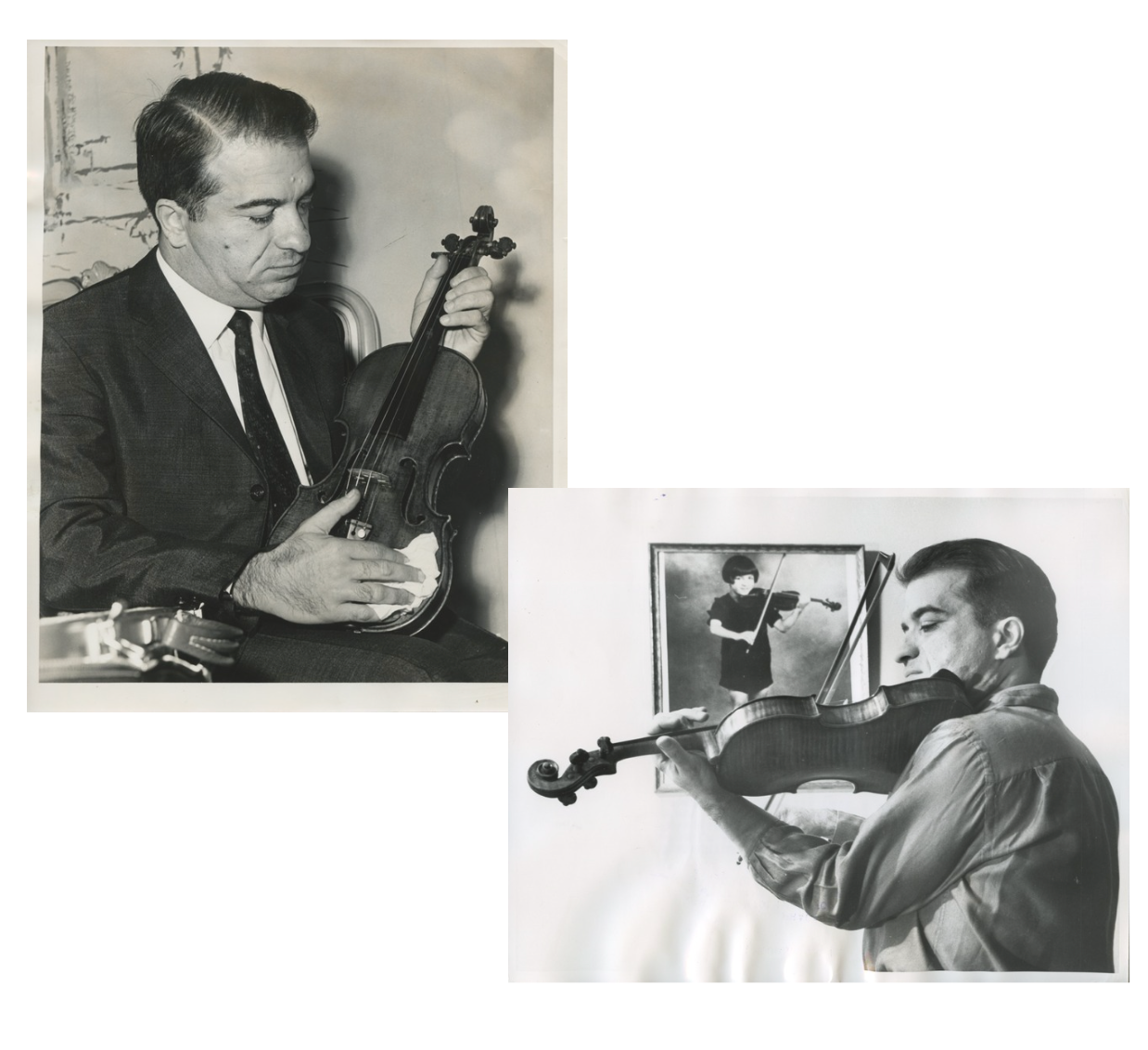 Original 1962 and 1965 press photographs of the superb fiddler, specialist in the 19th century bravura repertory. He is shown brushing dust from his 1724 Guarnerius and, in the other, playing it in front of a framed portrait of himself as a child. 8 x 10 inches (20 x 25 cm).