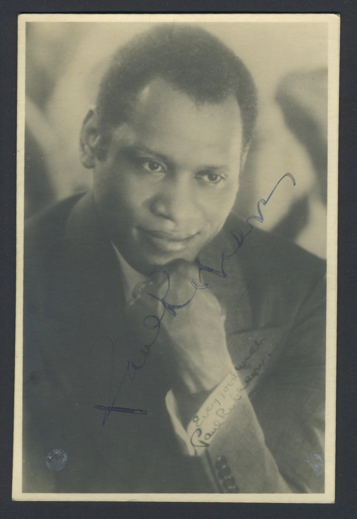 Signed postcard photograph of the great bass-baritone singer, writer, and civil rights activist. He is shown leaning his chin on his hand in a reproduction of a signed photograph, and has added a signature in blue ink across the card. Slightly poor contrast to the signature and some light toning, but overall fine. 3.5 x 5.5 inches (8.9 x 13.5 cm).