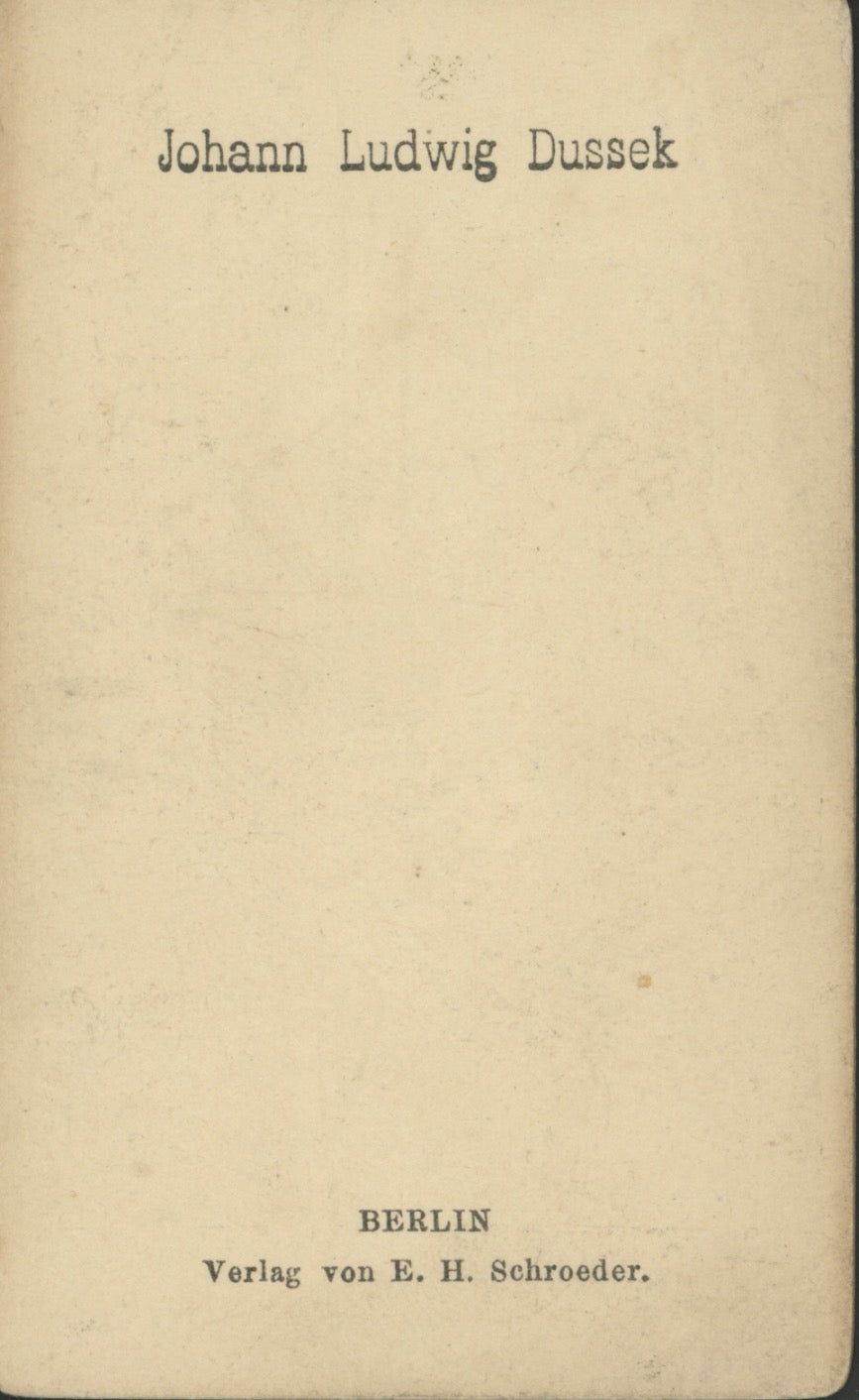 E. H. Schroeder of Berlin CDV of the Czech composer and pianist, shown in an albumen photographic reproduction of a portrait drawing. "Dussek" written in pencil in an unknown hand, "Johann Ludwig Dussek / Berlin / Verlag von E. H. Schroeder" printed to verso. 2.5 x 4 inches (6.4 x 10.2 cm.).