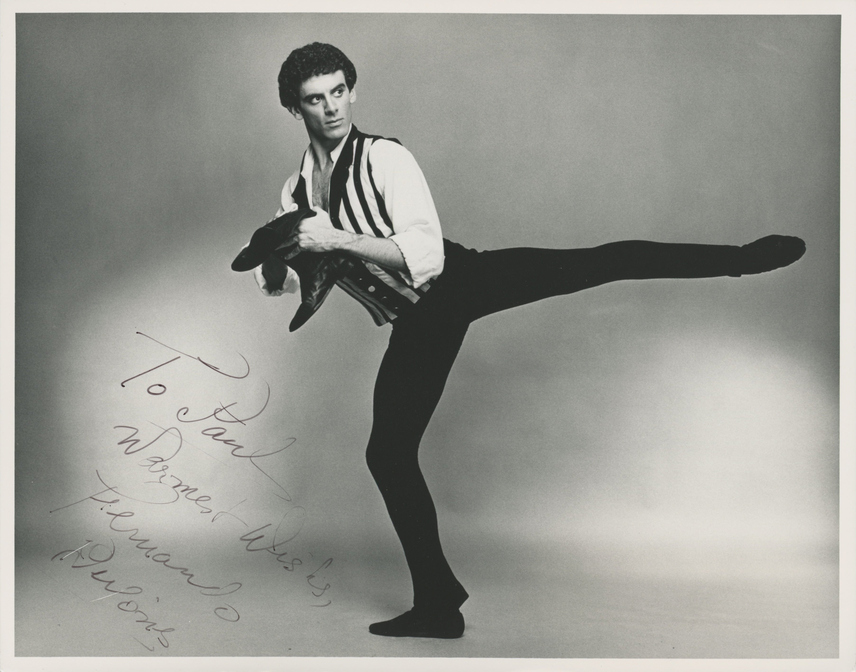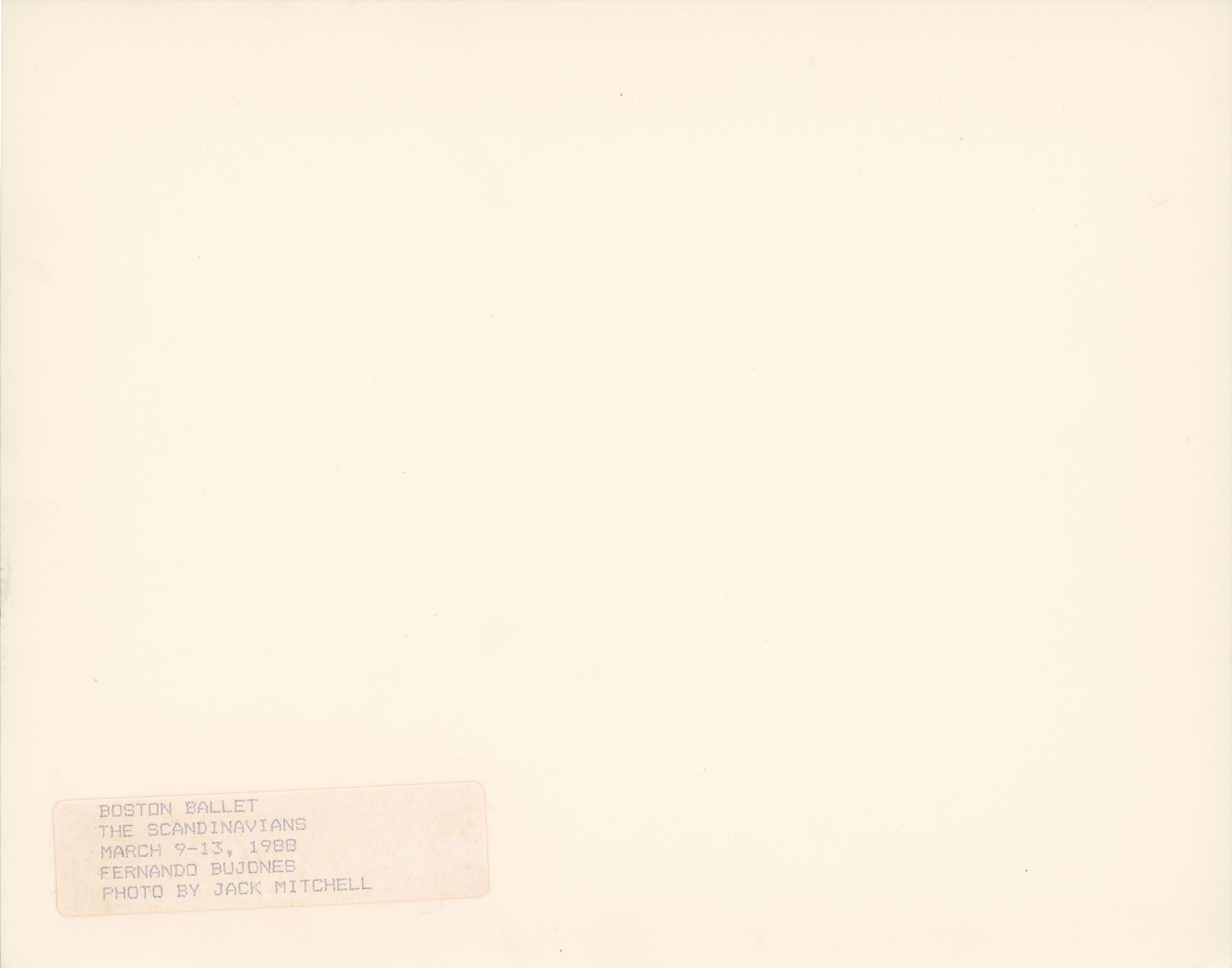 Signed Jack Mitchell photograph of the Cuban-American superstar ballet dancer, who has inscribed "To Paul / Warmest wishes, / Fernando Bujones" in black ink. Sticker to verso reads "Boston Ballet / The Scandinavians / March 9–13, 1988 / Fernando Bujones / Photo by Jack Mitchell." In very fine condition. 10 x 8 inches (25.4 x 20.3 cm.).
