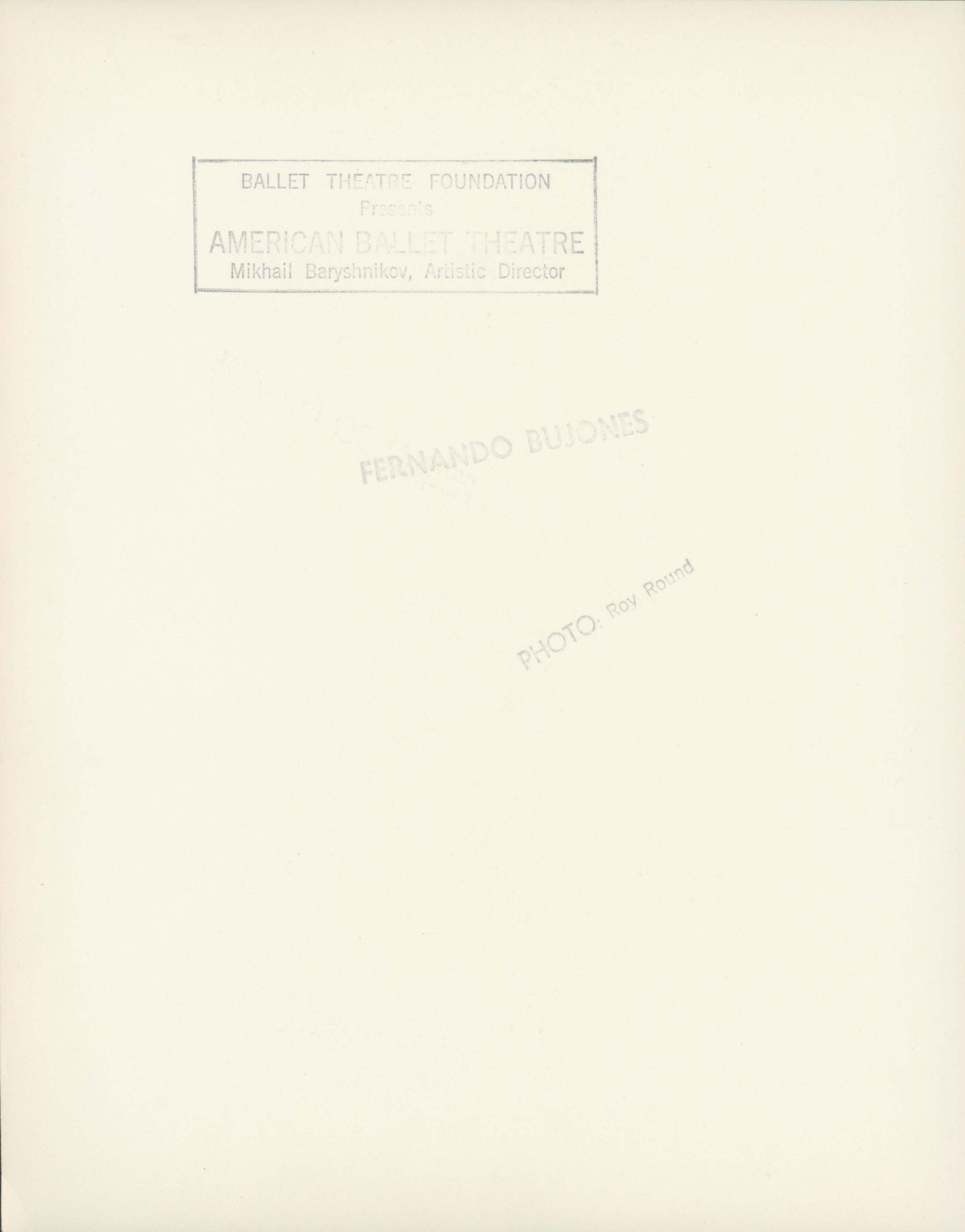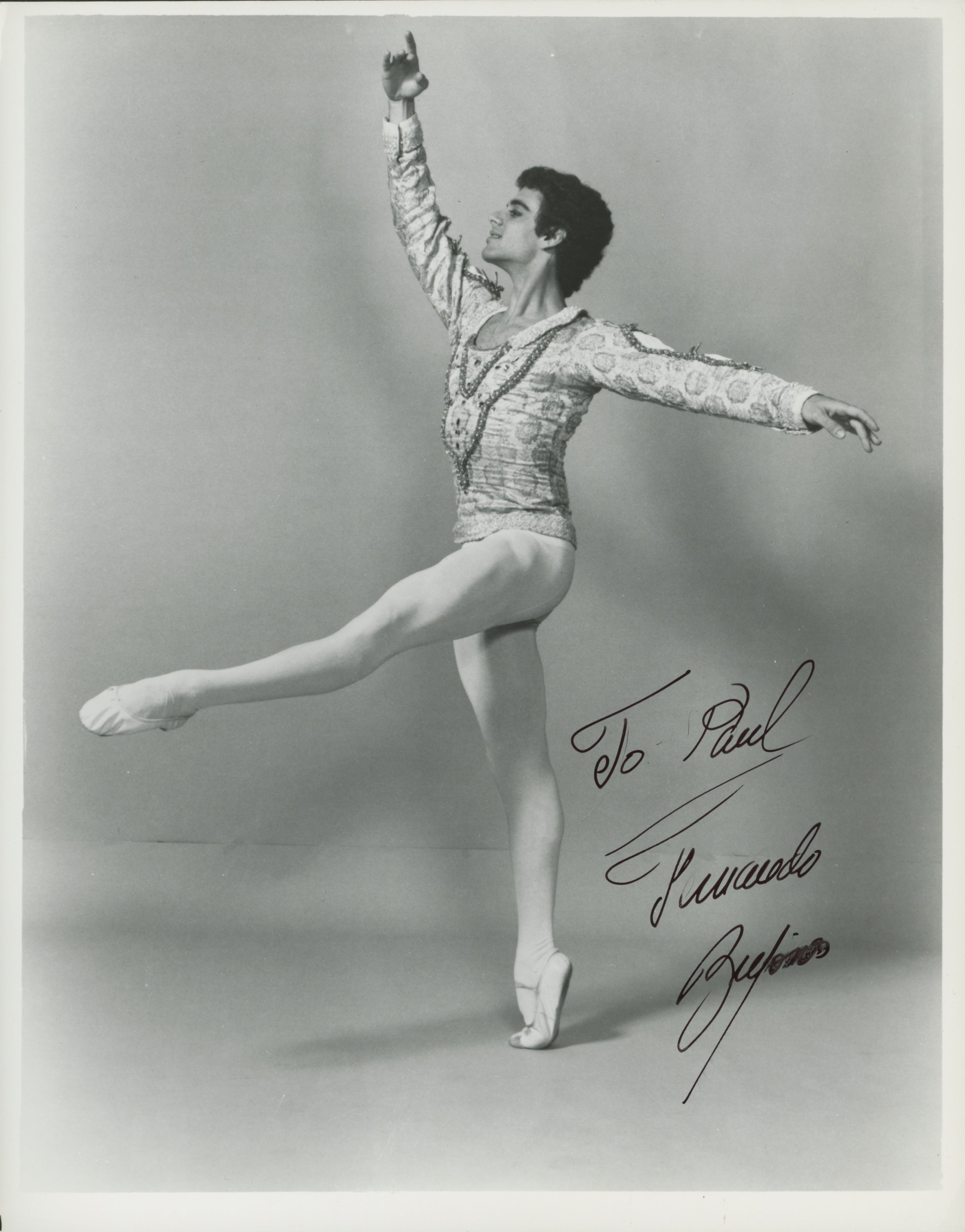 Signed Roy Round photograph of the Cuban-American superstar ballet dancer, who has inscribed "To Paul / Fernando Bujones" in black ink. American Ballet Theatre stamp and photographer's stamp to verso. Light wear to edges, overall in very fine condition. 8 x 10 inches (20.3 x 25.4 cm.).