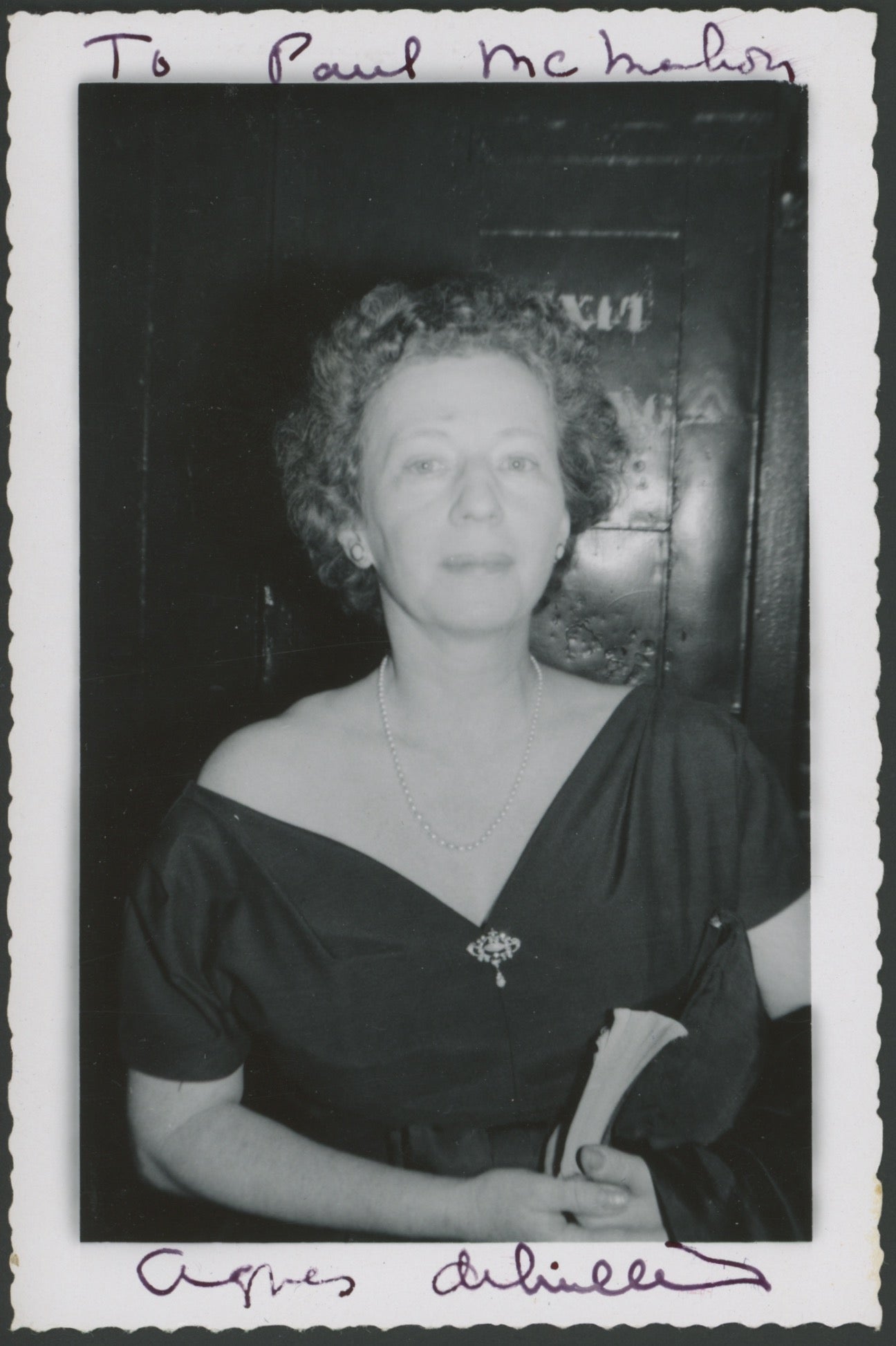 Signed candid photograph of the legendary American dancer and choreographer, who has inscribed "To Paul McMahon / Agnes de Mille" to the upper and lower margin. Deckled edges, in very fine condition. 3.25 x 4.5 inches (8.2 x 11.4 cm.).