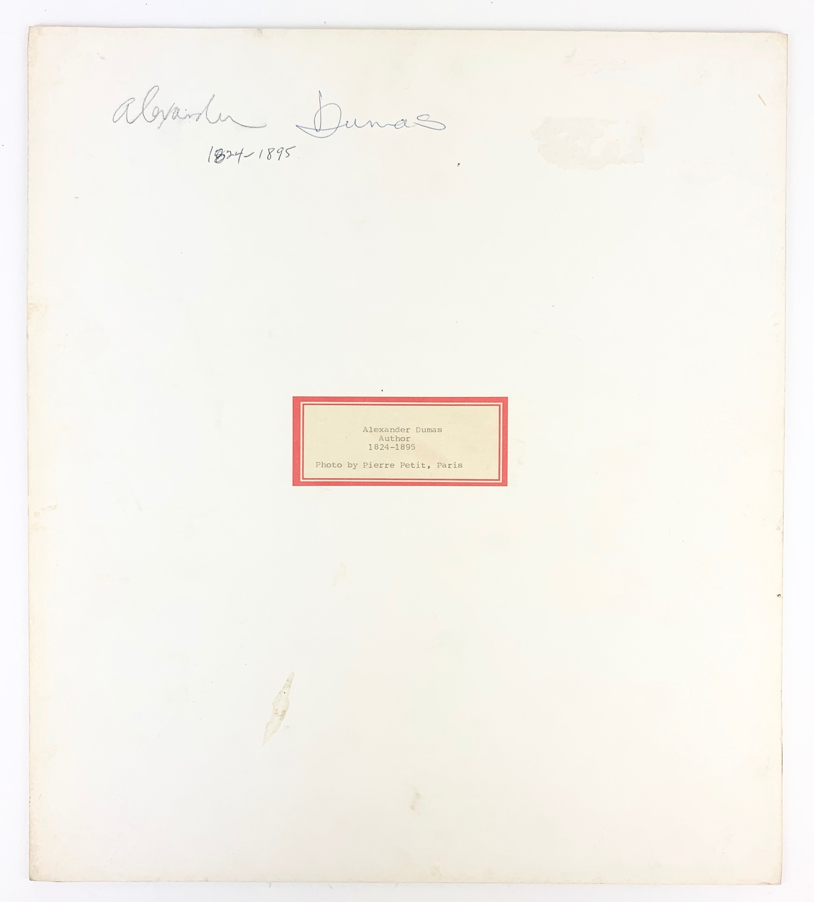 Original silver gelatin portrait photograph of the distinguished French novelist, author of such historical classics as The Count of Monte Cristo, The Three Musketeers, and The Man in the Iron Mask. Photographed by Pierre Petit, Paris, ca. 1865, printed somewhat later. Unsigned. Sight 8.25 x 10 inches (20.9 x 25.4 cm.); matted to an overall size of 14.25 x 16.25 inches (36.2 x 41.3 cm.). Silvering throughout, mild marks to upper left and right, tipped to rigid backing (easily removed) and overall in fine condition.