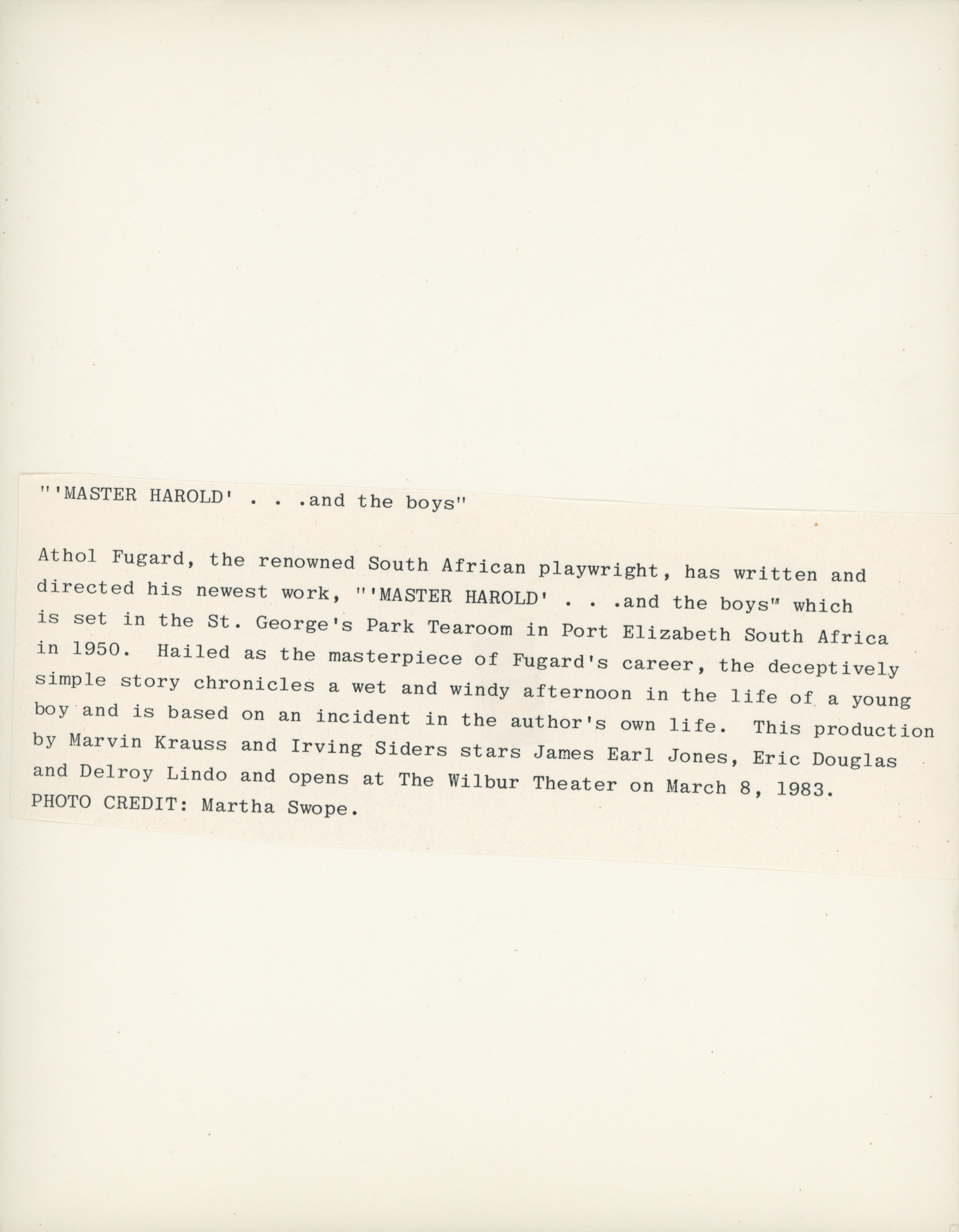 Signed photograph of the South African playwright, who has inscribed "Paul, / Thank you for being present, / Athol" in black felt-tip. Fugard is shown sitting inside the St. George's Park Tea Room in Port Elizabeth, the setting for his 1982 play "Master Harold" ...and the Boys. A press note mounted to verso announces an upcoming production of the play at the Wilbur Theatre in Boston, opening on March 8, 1983. In very fine condition. 8 x 10 inches (20.3 x 25.4 cm.).