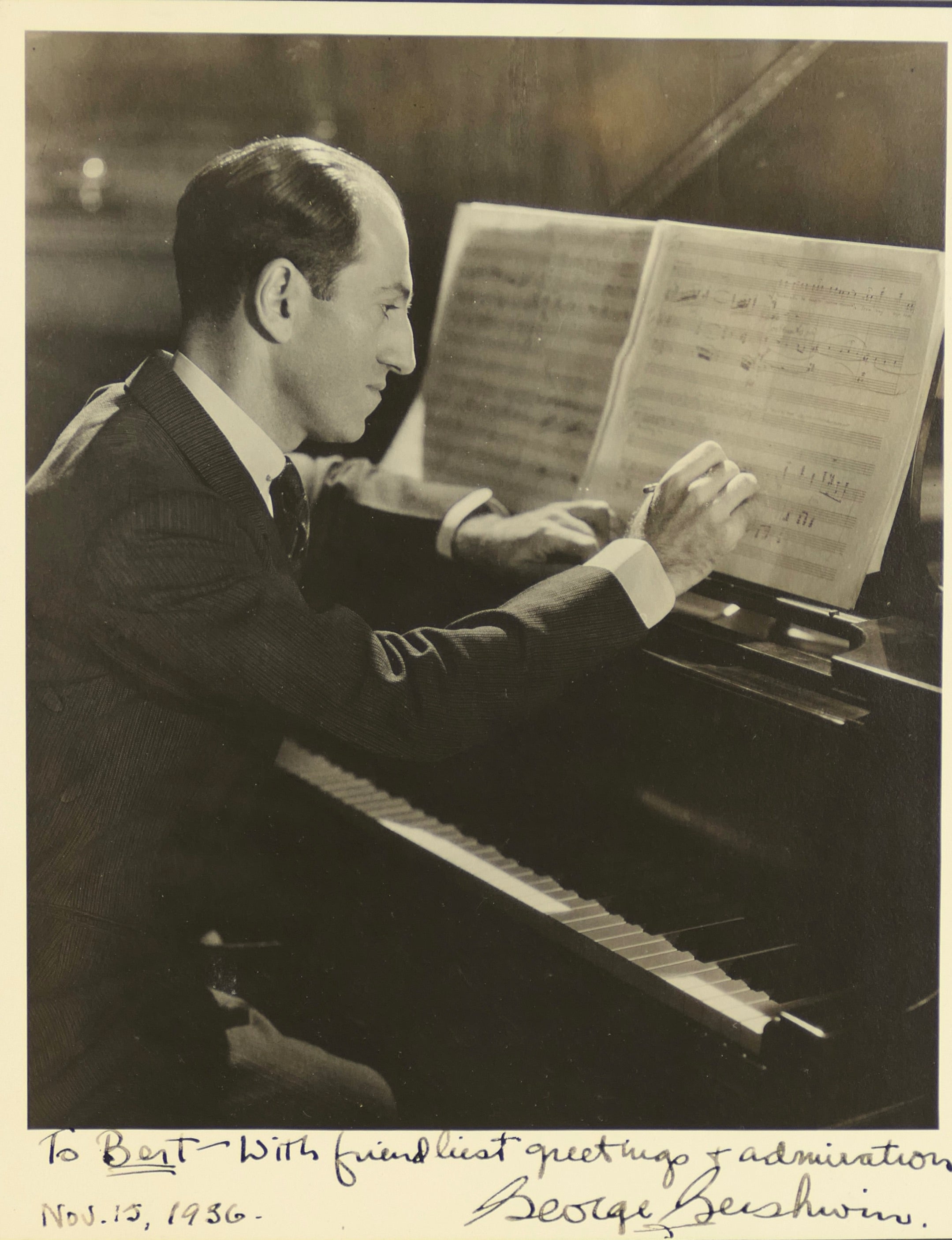 Doubleweight silver gelatin Renato Toppo of New York photograph portrait of the composer at the piano, signed and inscribed to the lower blank margin in black ink, "To Bert - with friendliest greetings + admiration / George Gershwin / Nov. 15 1936". Photograph measures 10 x 7.76 inches (25 x 20 cm); fixed to a mat 14 x 11 inches (35 x 28 cm). Very fine.