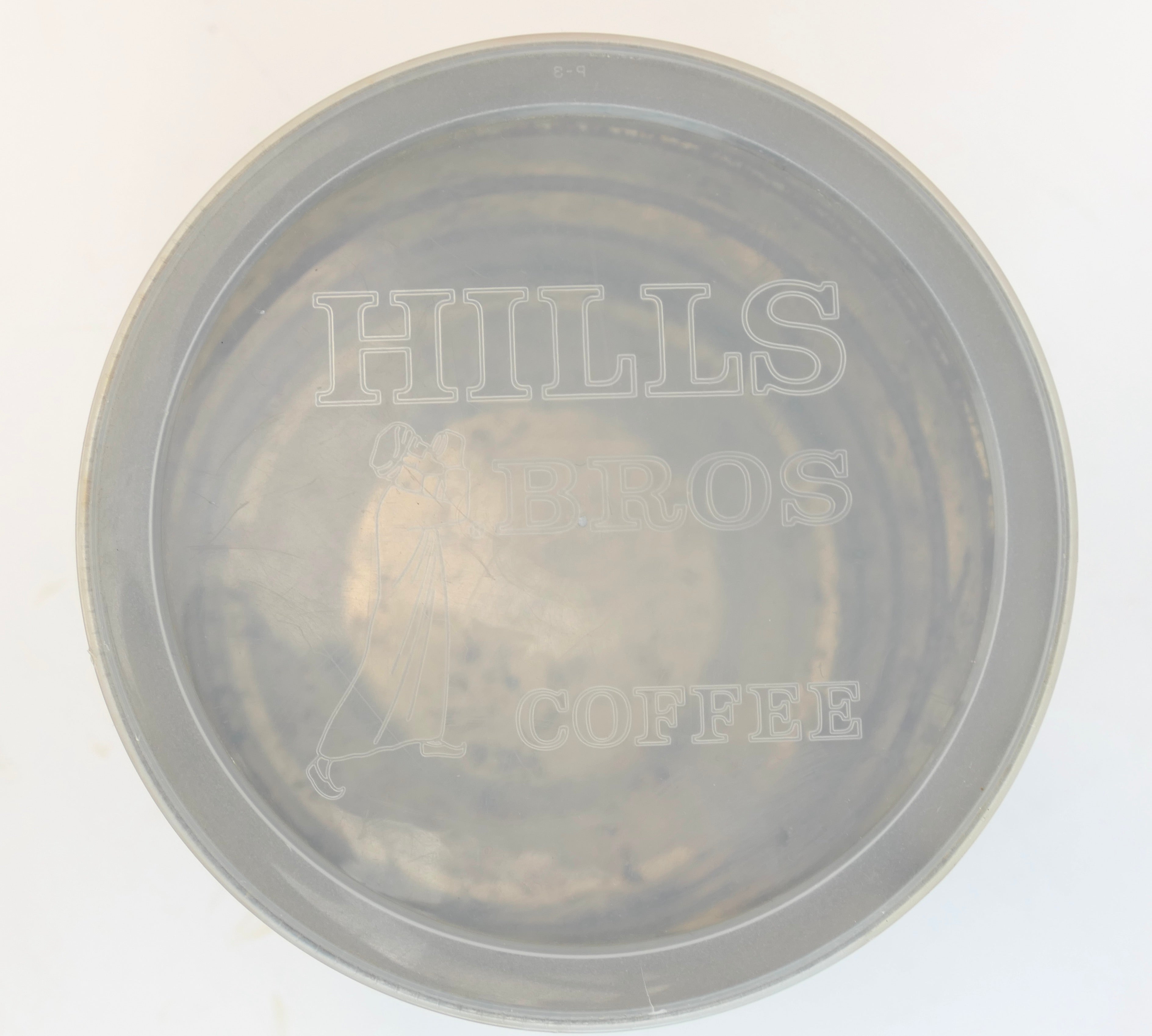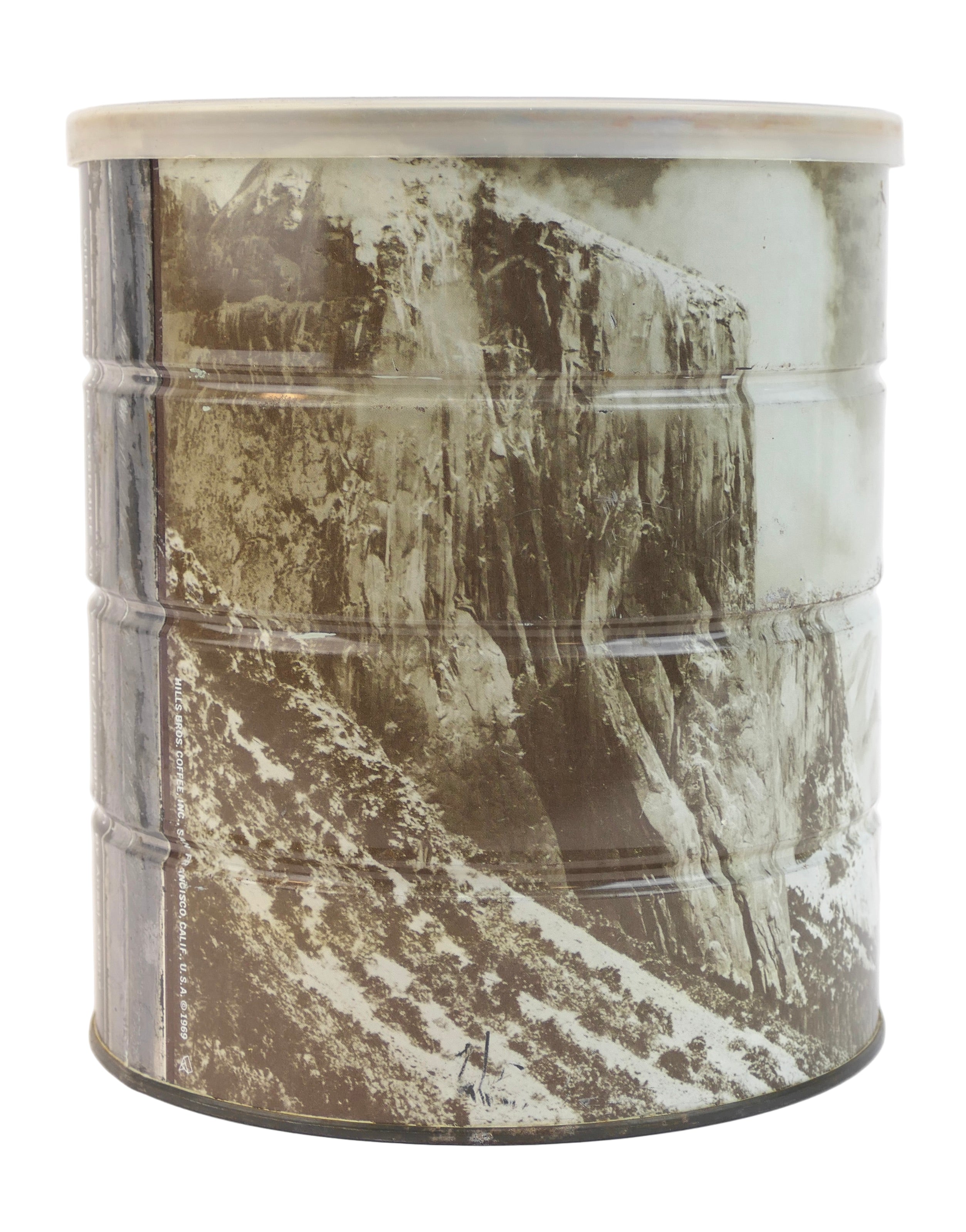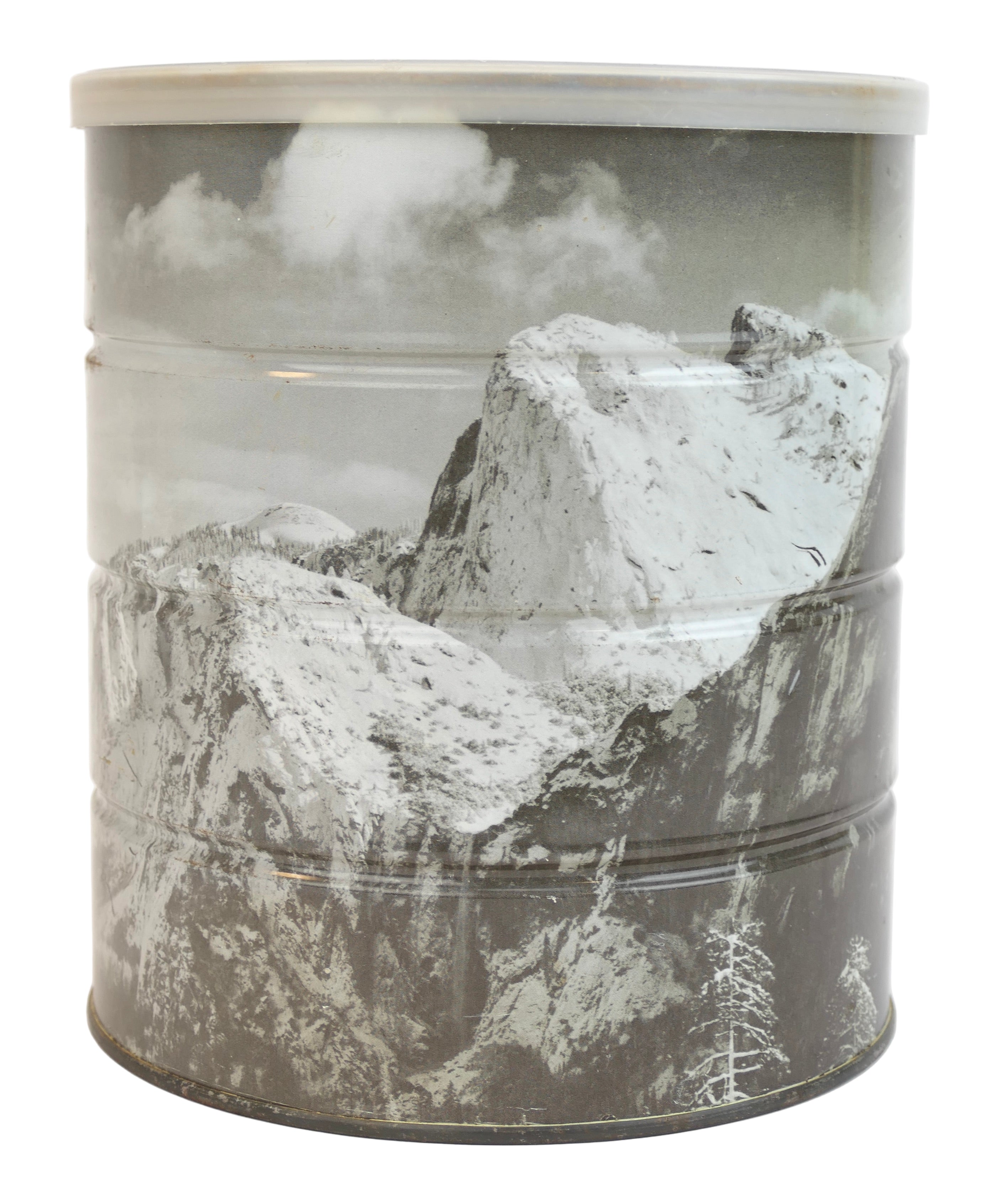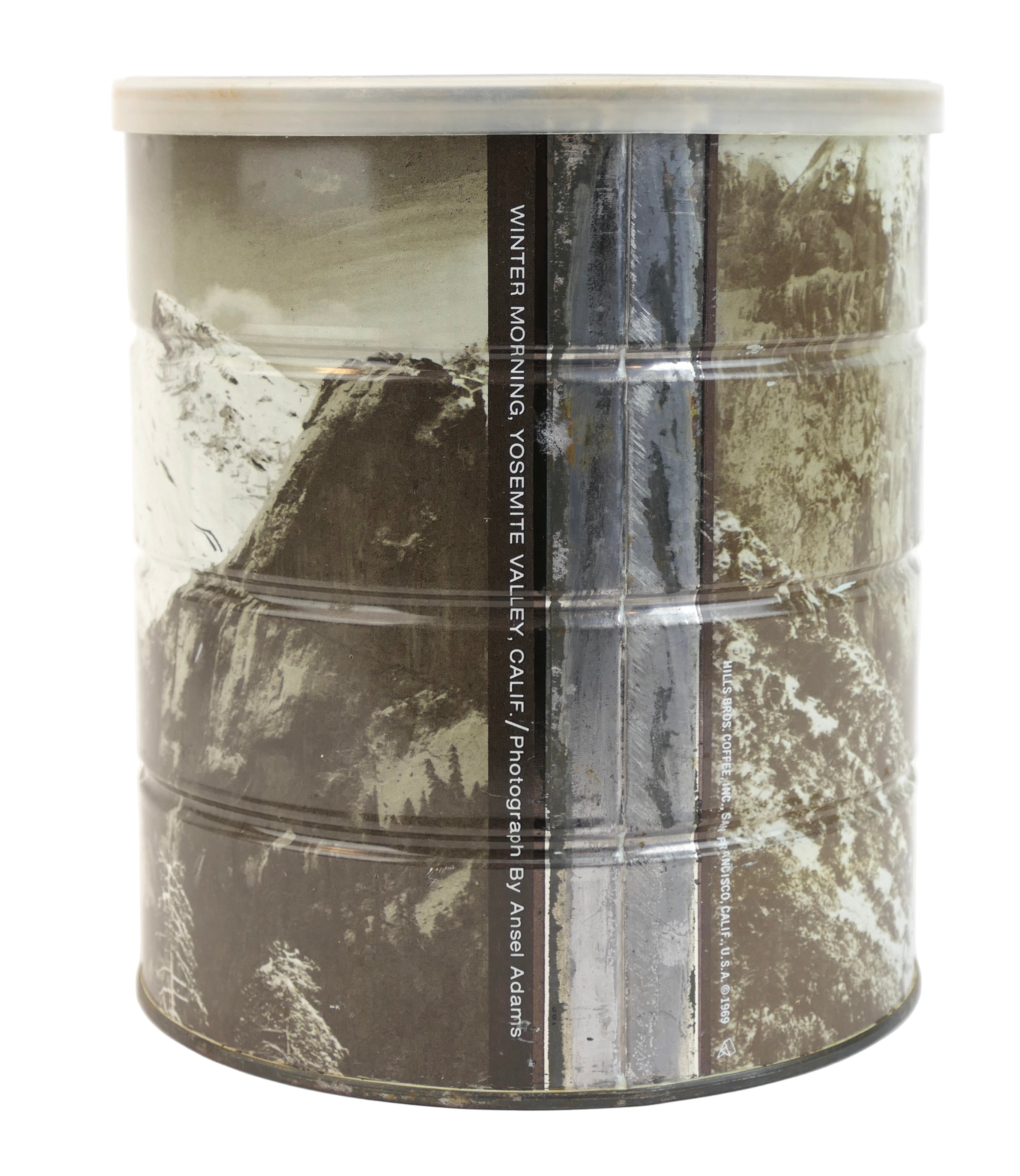 Hills Brothers tin coffee can with a sepia-tone reproduction of the famed American photographer's "Winter Morning Yosemite Valley California," printed to exterior, 1969. Tin with plastic lid, credit and title on the can. Light rubbing and a few spots around the edges, usual rusting and marks to underside and interior, overall fine. 7 x 6 inches.