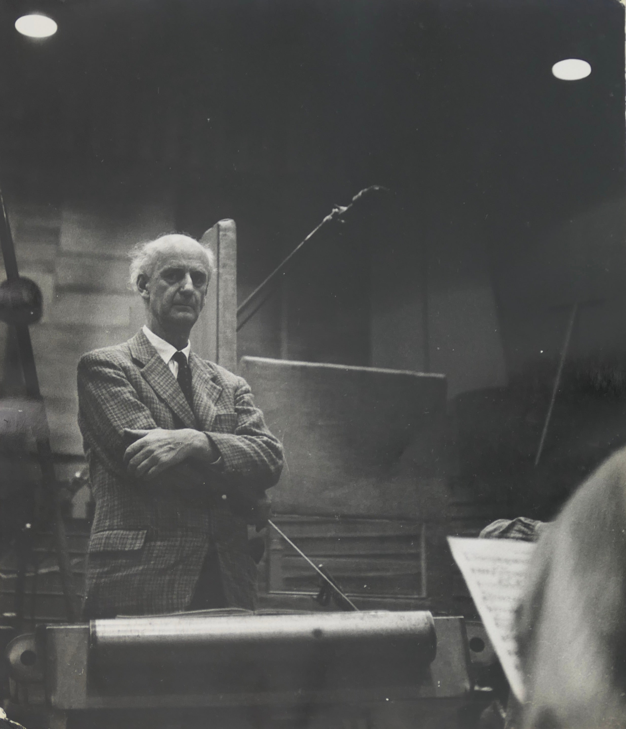 A fine and evocative original large format doubleweight photograph of the great conductor, shown standing in an unknown London rehearsal setting. Stamped on the verso by Maiteny of London. Light wear to corners and edges, else fine. 10 x 12 inches.