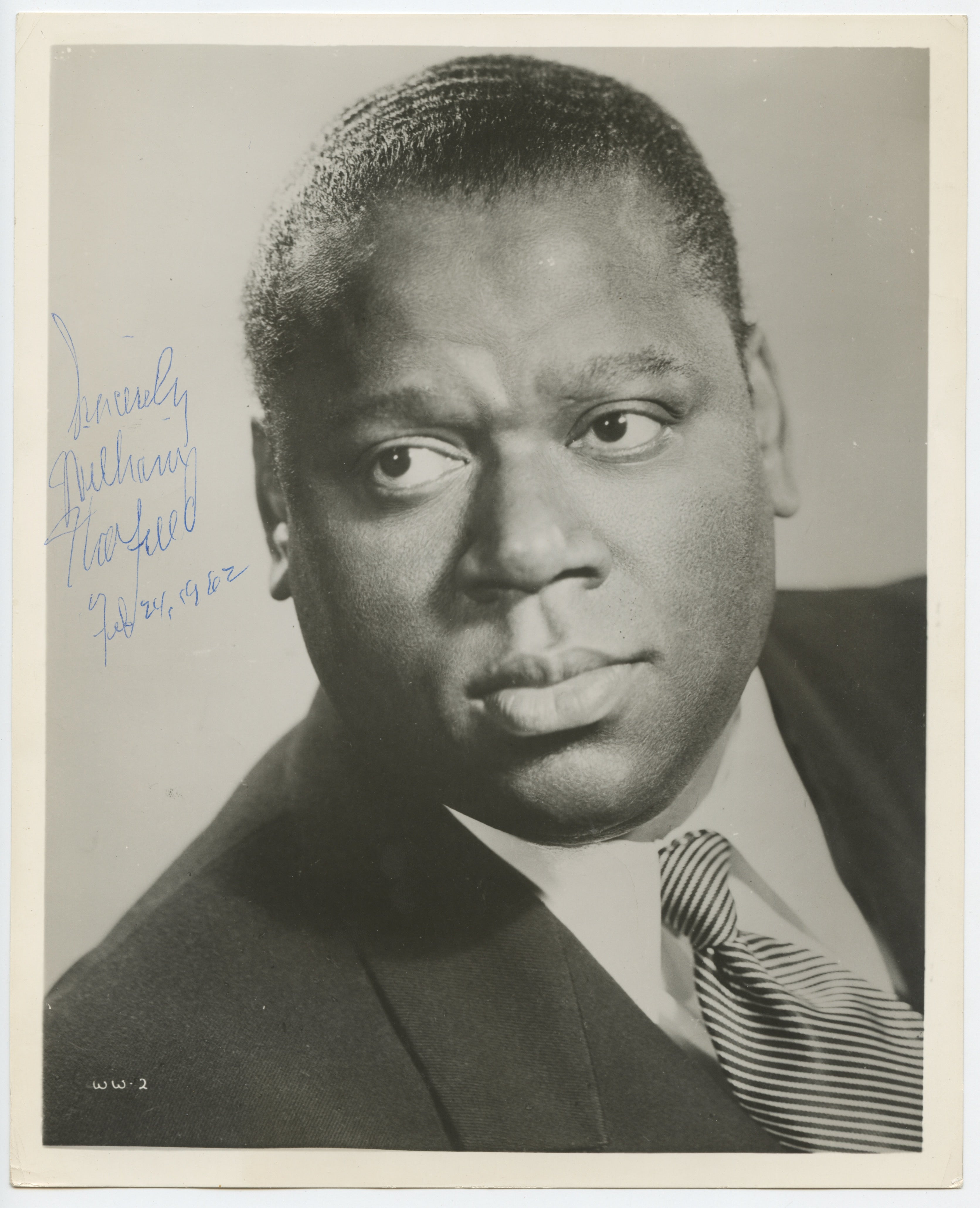 Signed photograph of the powerful bass-baritone, celebrated among other achievements for his magnificent recordings of works by Copland and Gershwin. 8 x 10 inches, signed "Sincerely William Warfield Feb 24, 1962" in bold blue ink. Very fine.