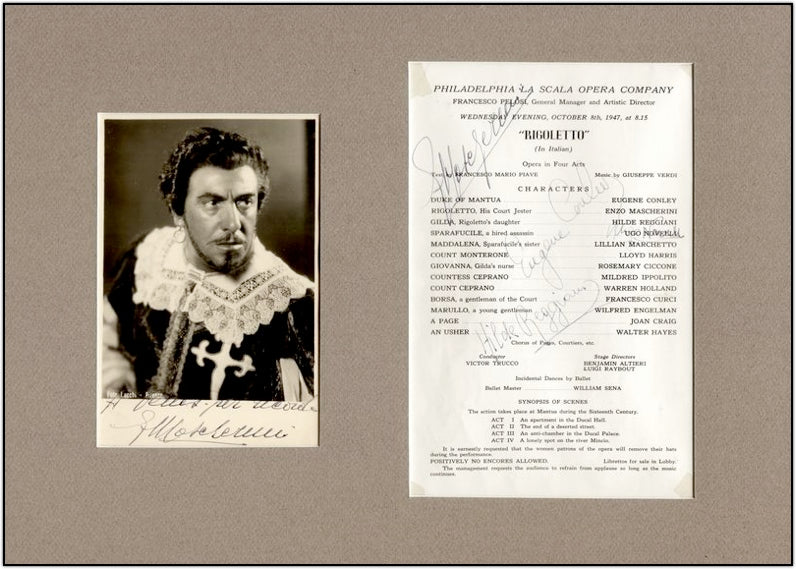 ISP, bw, 41/2"x63/4" signed by Italian baritone ENZO MASCHERINI (1911-1981) in costume in title role of Rigoletto in 1947, matted with signed Philadelphia La Scala Opera Company program page for Rigoletto signed by Mascherini plus fellow cast members EUGENE CONLEY; UGO NOVELLI; and HILDE REGGIANI.