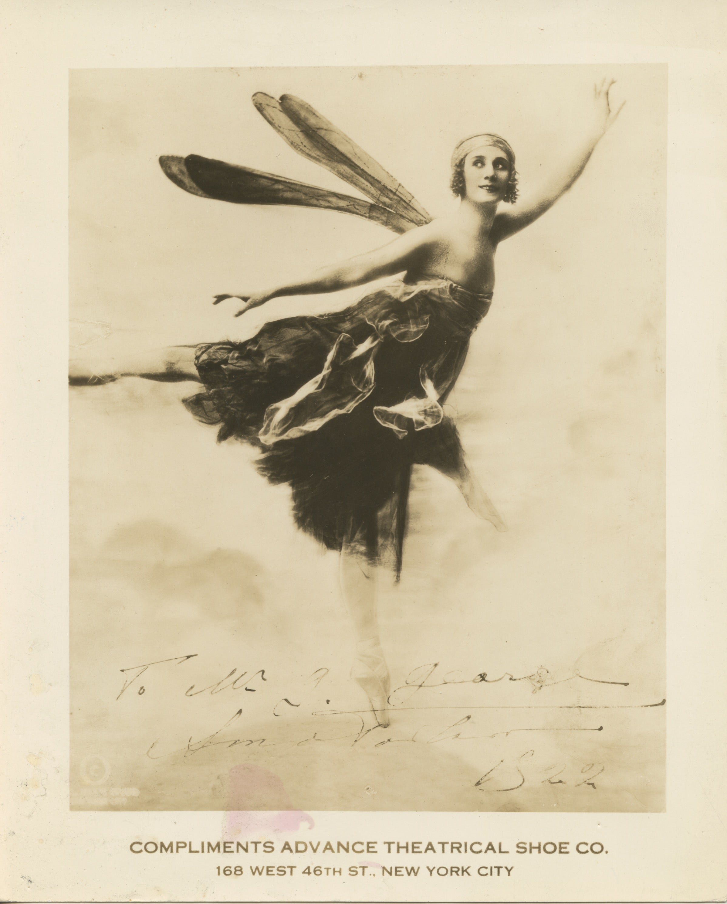 Pavlova, Anna. (1881-1931). "Advance Theatrical Shoe Co." ca. 1925 Publicity Photograph . Doubleweight sepia photograph of the legendary ballerina in her signature "Dragonfly" ballet, the photograph issued by the Advance Theatrical Shoe Co., signed and inscribed within the image (printed). A few small stains, else fine. 8 x 10 inch (20 x 25 cm).