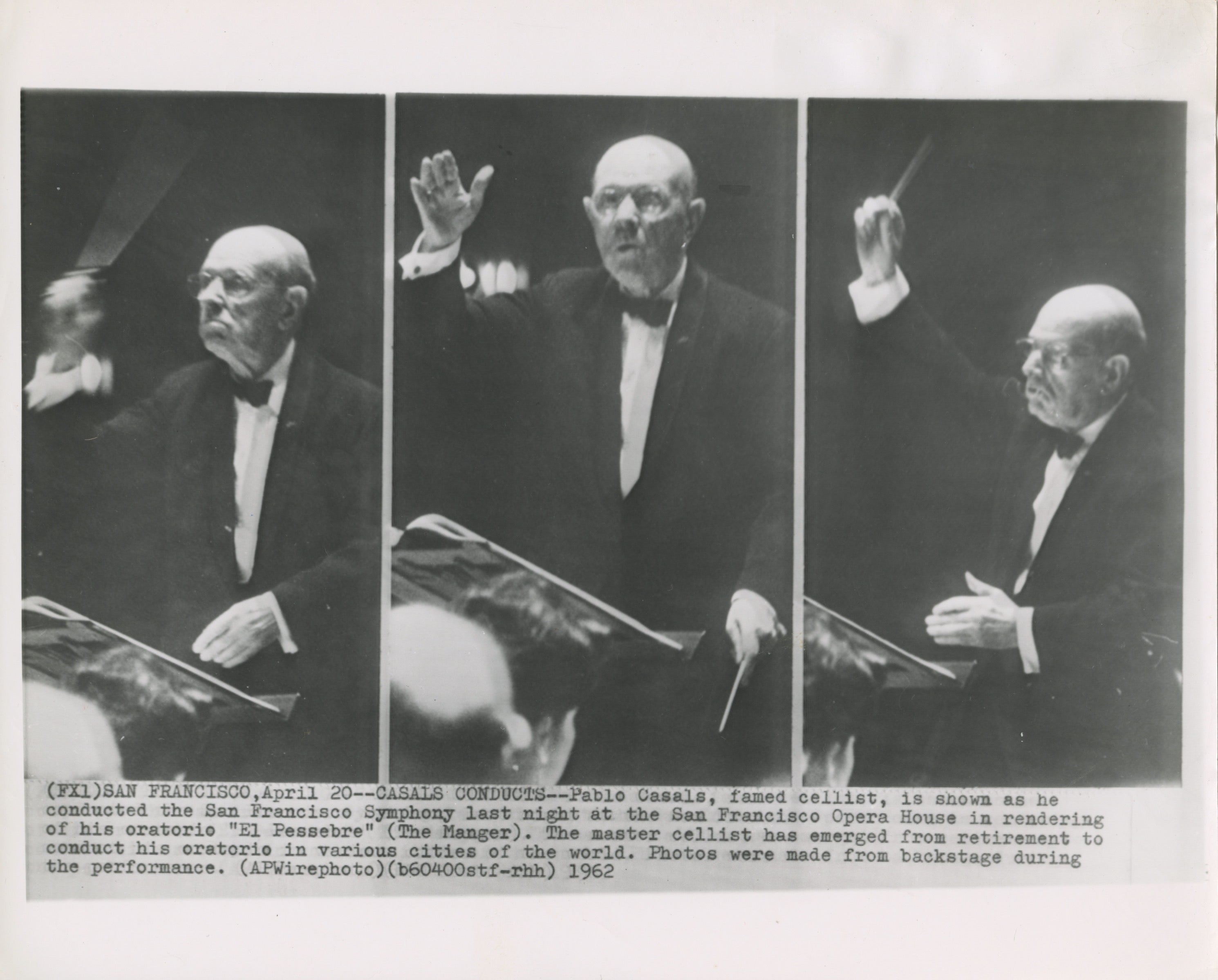 Vintage three-frame 1962 wire photograph of Casals conducting his "El Pessebre" oratorio in San Francisco. Fine. 8 x 10 inch (20 x 25 cm).
