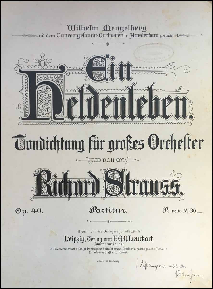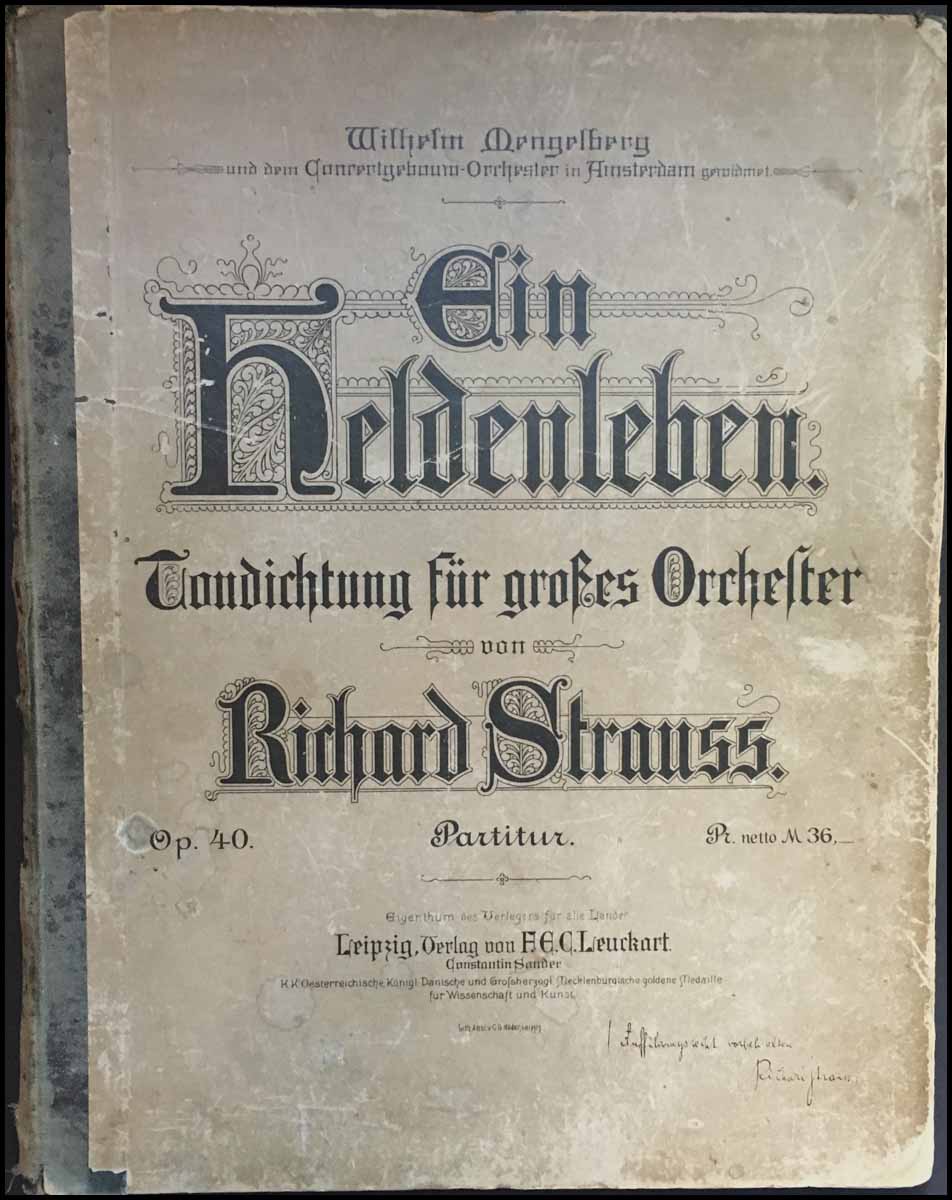 Strauss, Richard. (1864–1949) [Panzner, Karl. (1866–1923)]. Ein Heldenleben. Tondichtung für großes Orchester [...] Op. 40.. Leipzig: Leuckart. 1899. First Edition. Full score. Large upright folio. 139 pp. [PN] 5200. Rubbed and bumped, spine shaken and splitting from the block. Conductor's markings throughout in graphite and colored pencil. The head of the first page of score with the stamp of the Philharmonische Concerte Bremen. Mueller von Asow Bd. 1, p. 241; Trenner, p. 179 (Nr. 190).