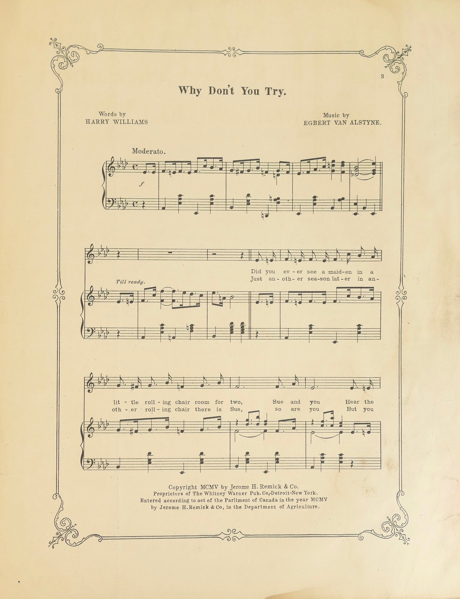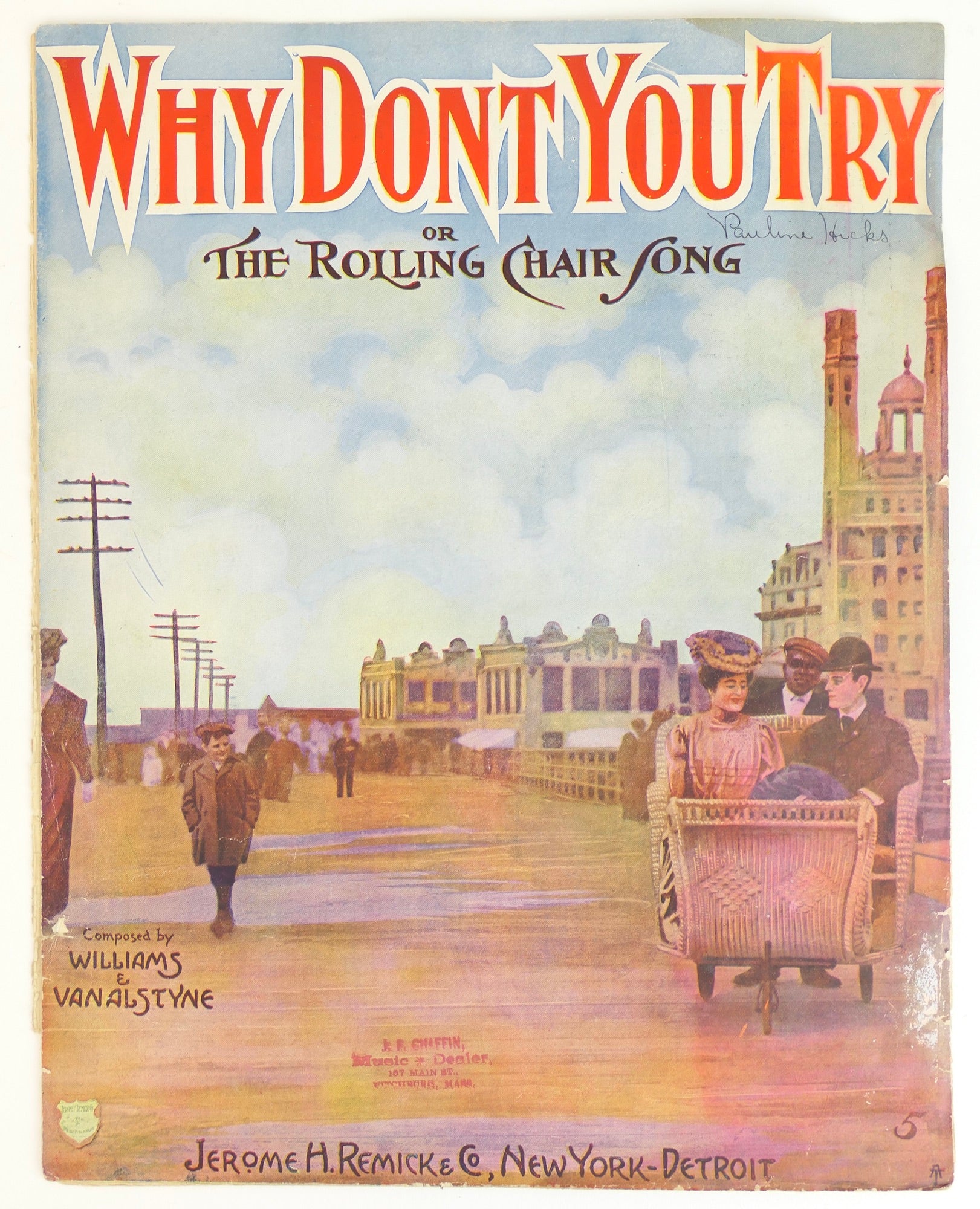 Popular song for voice and piano by the singer-songwriter team of the early 20th century. New York: Jerome H. Remick, 1905. Attractive full-page cover illustration depicting a formally-dressed white couple in a rolling chair on a boardwalk; the chair is pushed by a Black man. 3-5 pp. Signature of former owner, "Pauline Hicks." Leaves detached, slightly damp stained and frayed to edges. Cover in good condition.