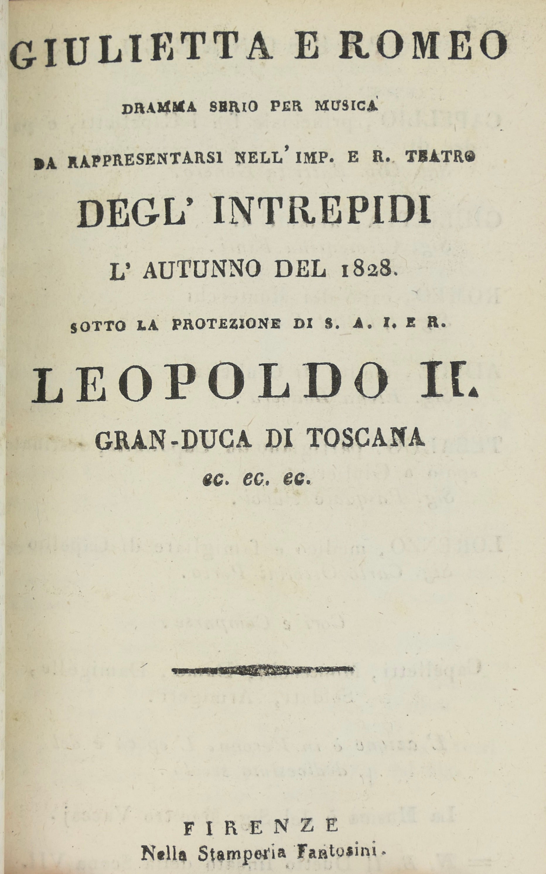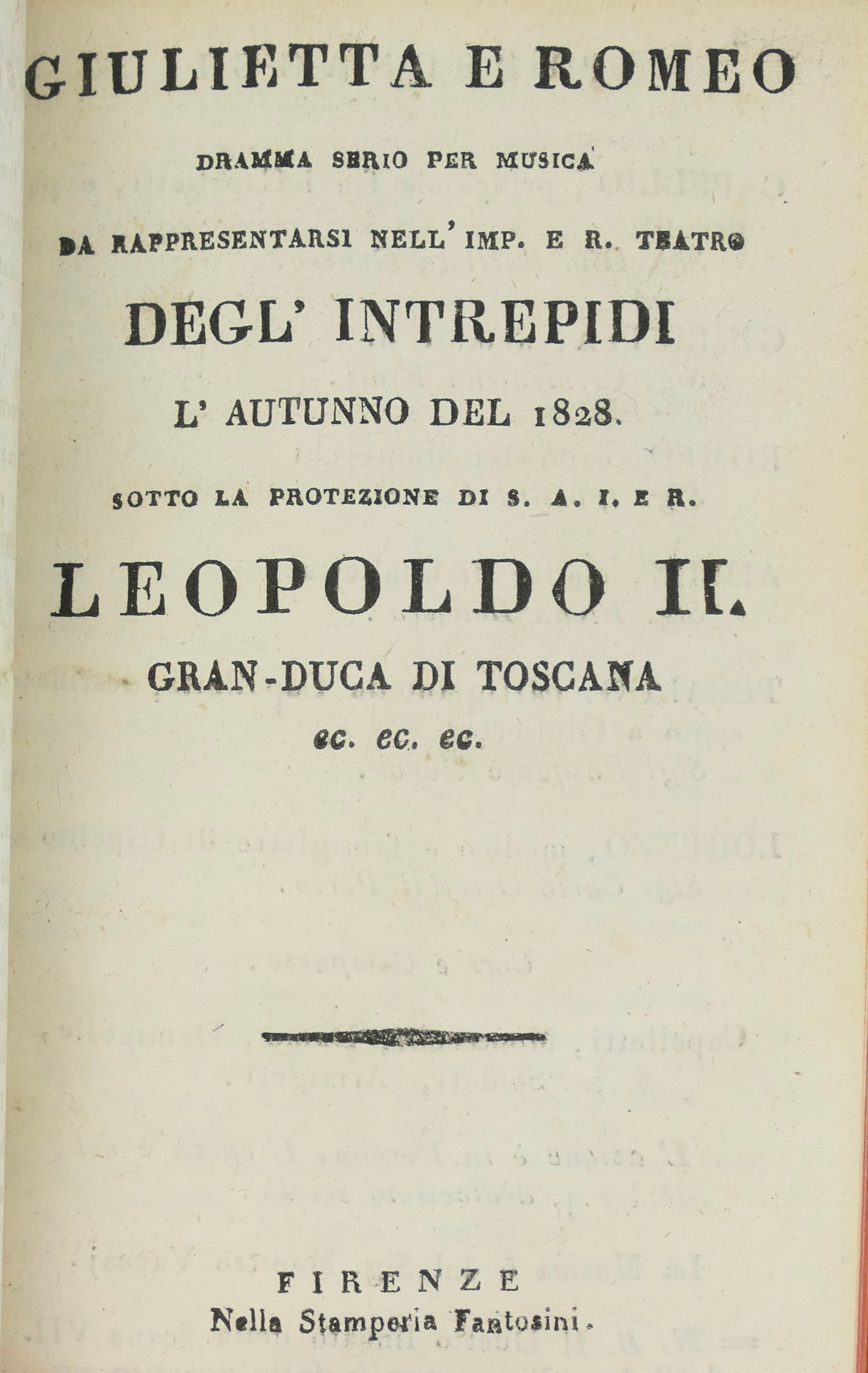[Romani, Felice] (music by Vaccaj). Giulietta e Romeo / Dramma serio per musica... Teatro degl'Intrepidi... (Florence: Fantosini, 1828). 40 pp.