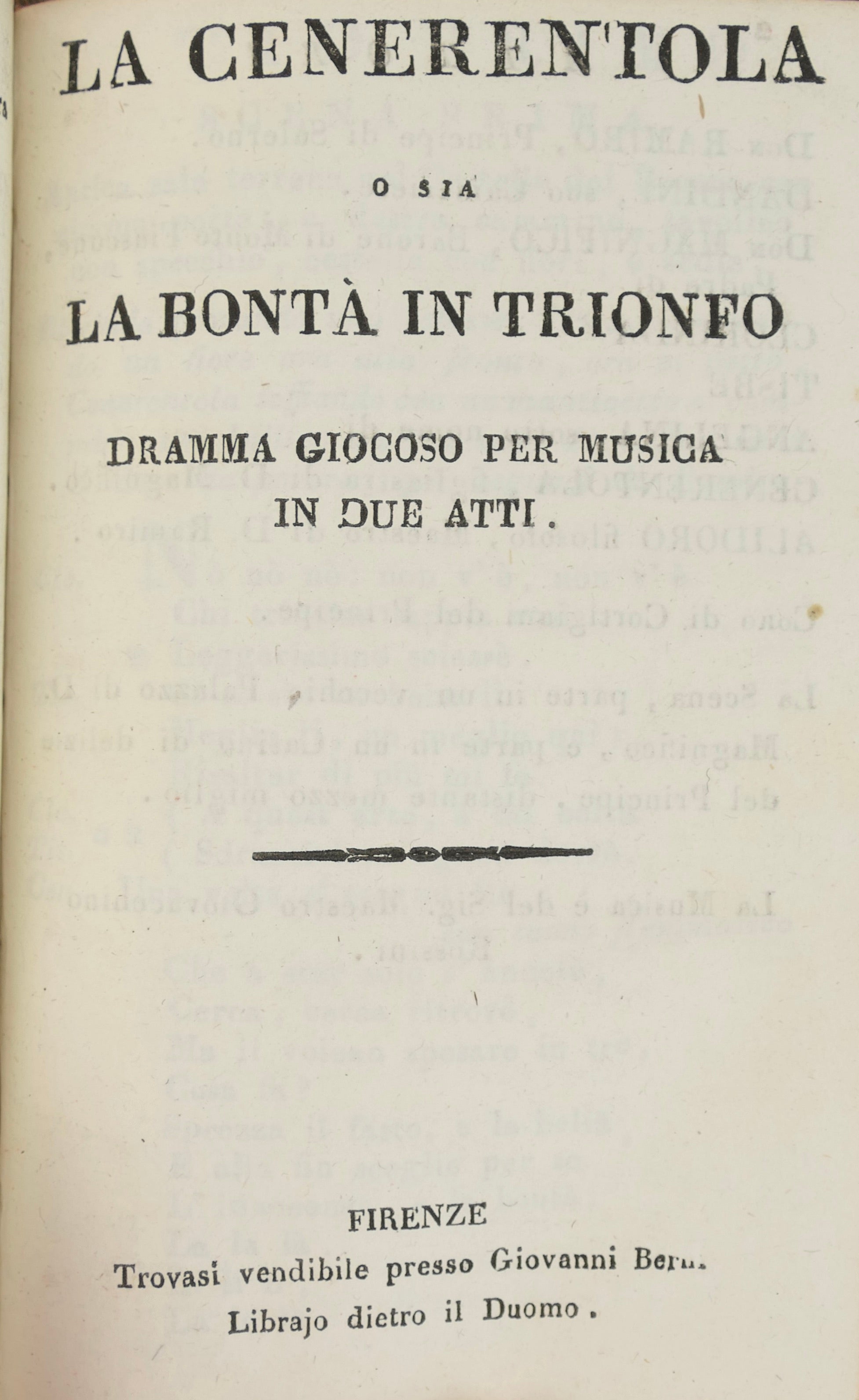 [Ferretti, Jacopo] (music by Rossini). La Cenerentola... Dramma giocoso per musica... (Florence: Giovanni Berni, n.d.). 47 pp.