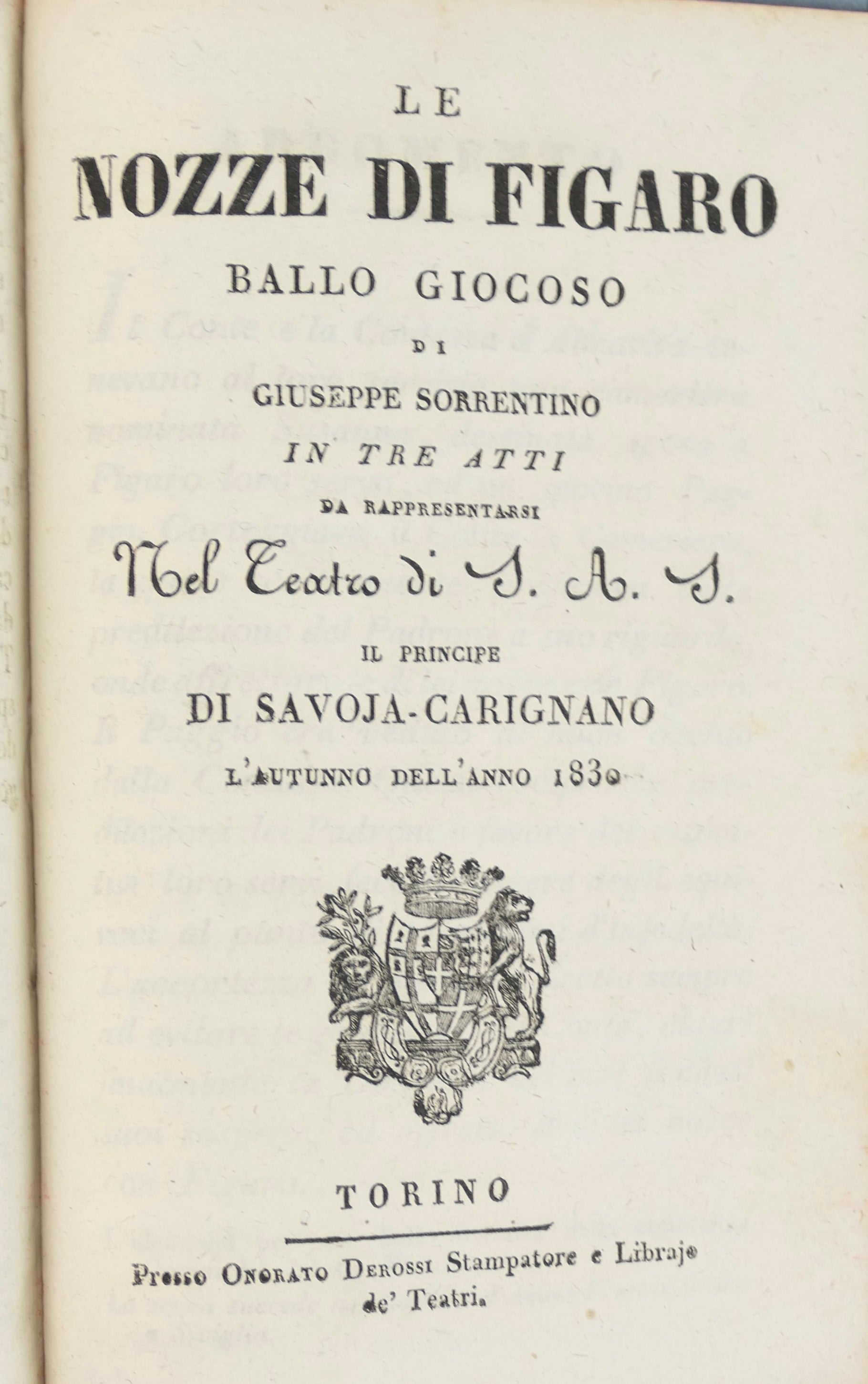 Sorrentino, Giuseppe. Le Nozze di Figaro / Ballo giocoso... Teatro di... Principe... Carignano (Turin: Onorato Derossi, 1830). 10 pp.