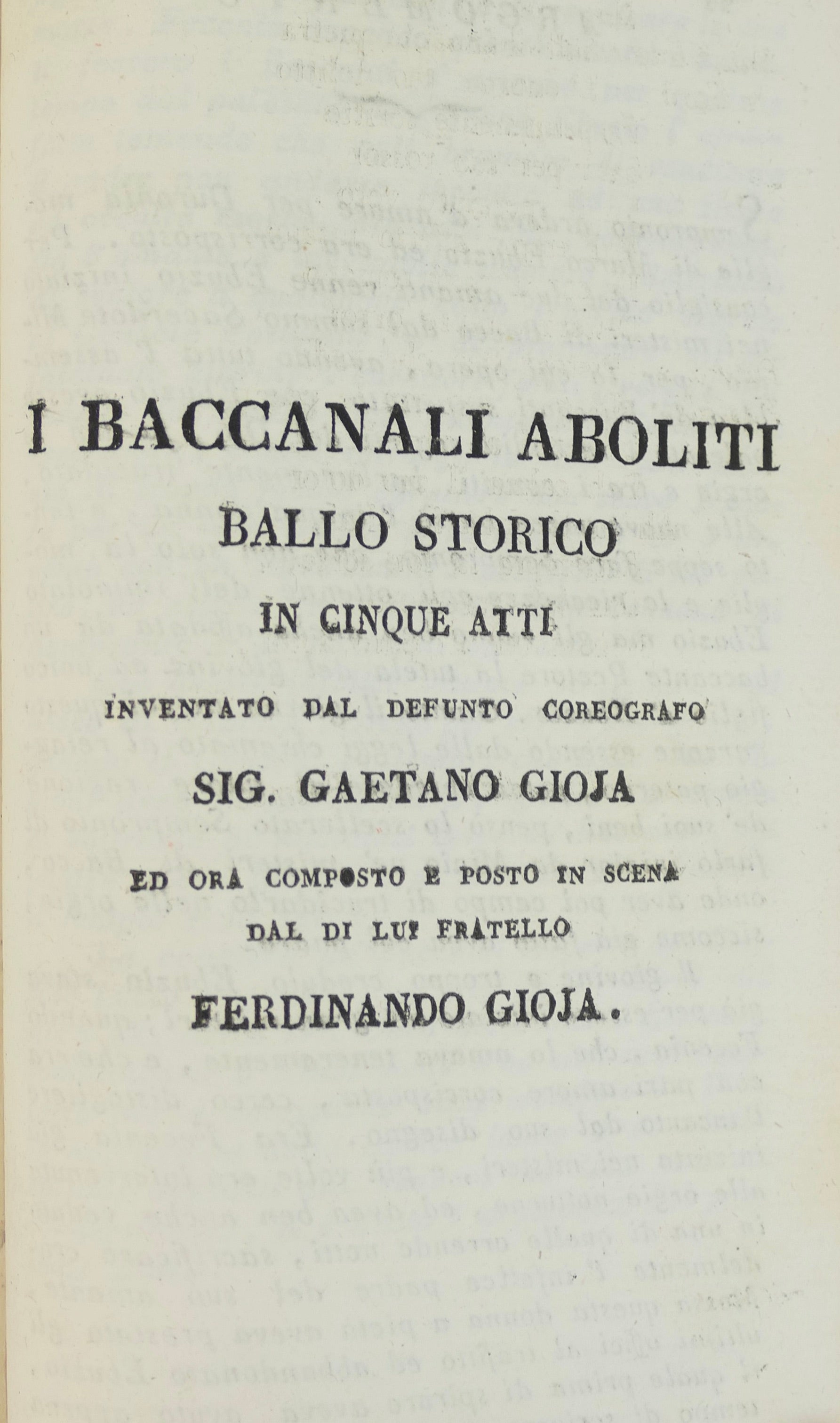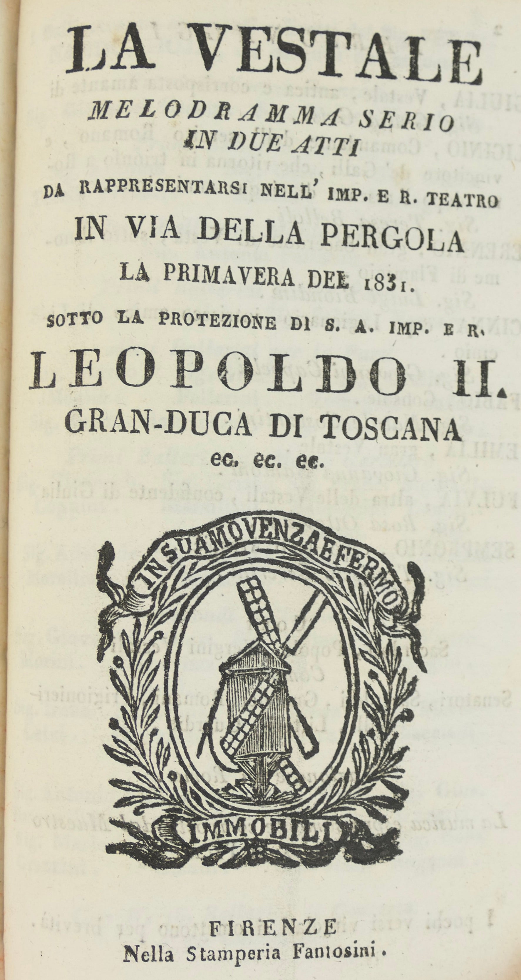 [Double bill] [Romanelli, Luigi] (music by Giovanni Pacini). La Vestale / Melodramma serio... 1–20, 31–41 pp. and Gioja, Ferdinando (after Gioja, Gaetano). I Baccanali aboliti / Ballo storico... pp. 21–30 (presented as an intermezzo between the two acts of the opera) Teatro in via della Pergola... (Florence: Fantosini, 1831).