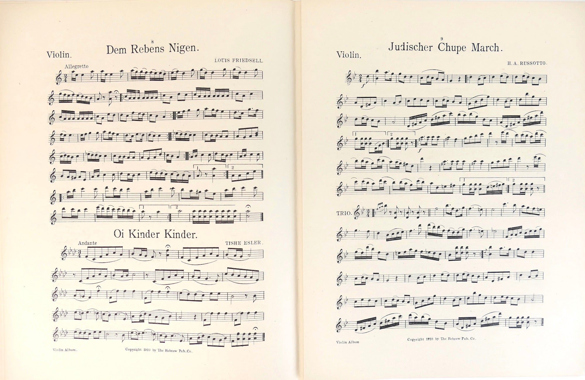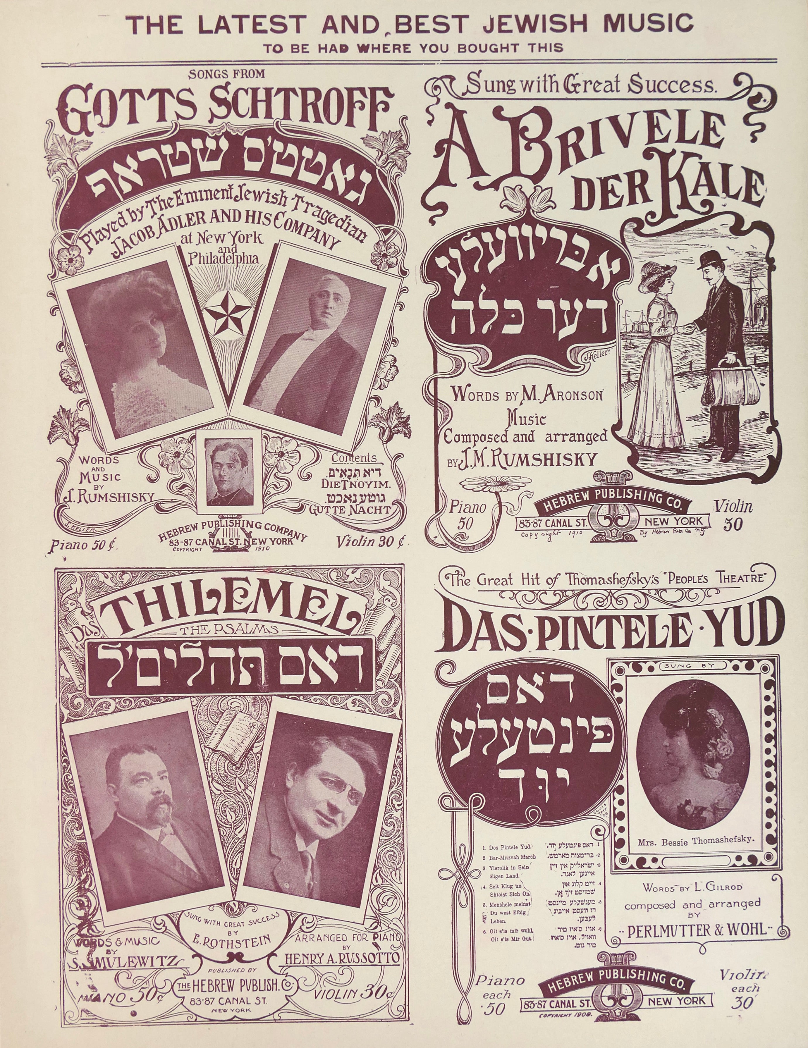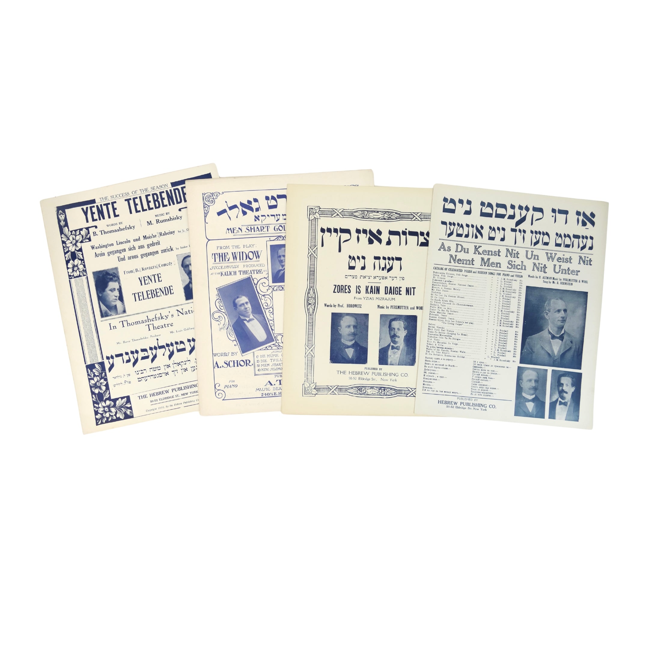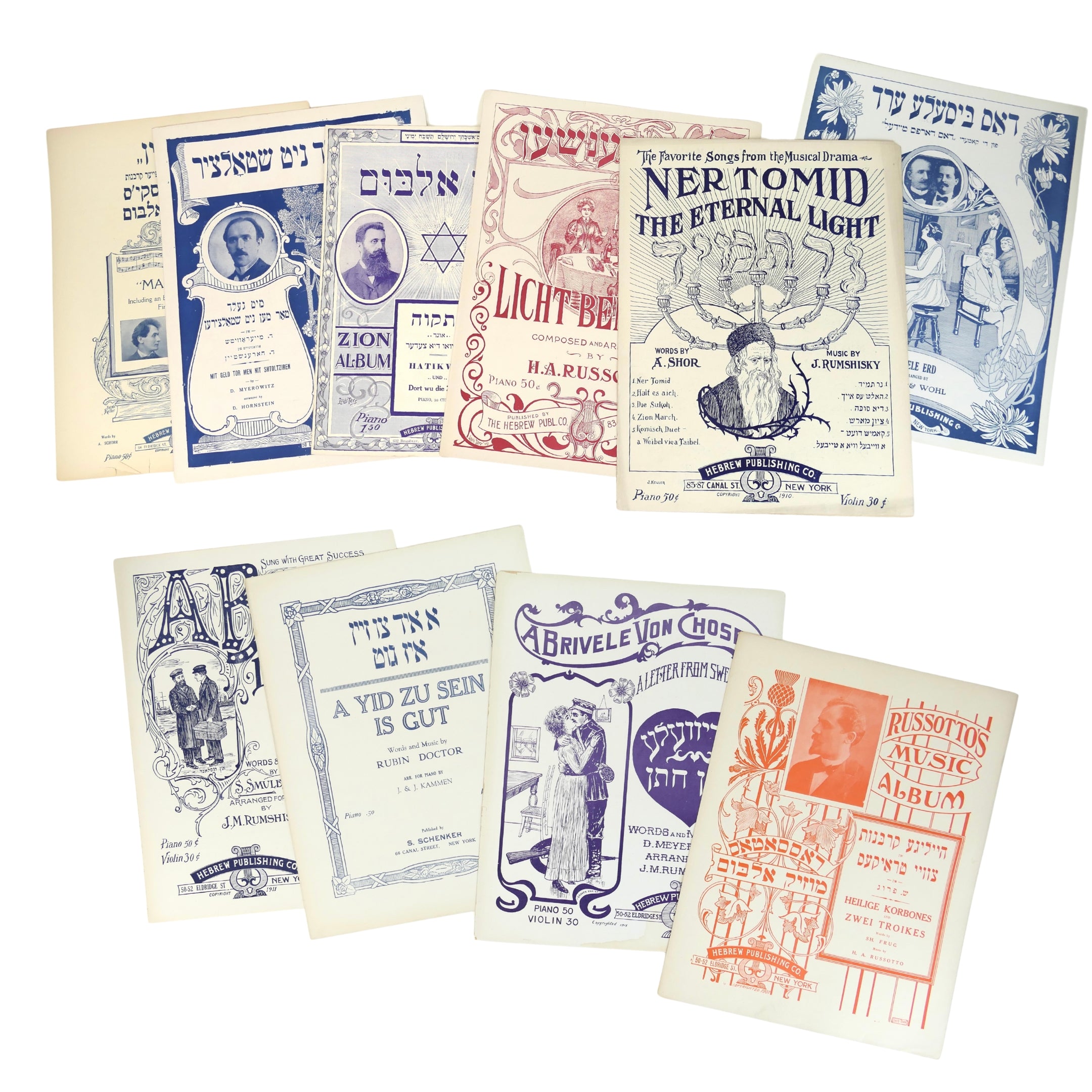 Rare collection of late 19th and early 20th century Yiddish/ Jewish-American Sheet Music, issued by the Hebrew Publishing Co. and much of it from the vaudevilles and operettas of the Yiddish Theatre in New York's Lower East Side. Group of 22 volumes of sheet music published in New York. New York: Hebrew Publishing Company, various; ca. 1908-1919. Mostly measuring about 10.5"' x 13.5" (27cm x 34cm). Most volumes very well-preserved, very bright and clean, with no markings, occasional closed tear or marginal chip, generally fine.