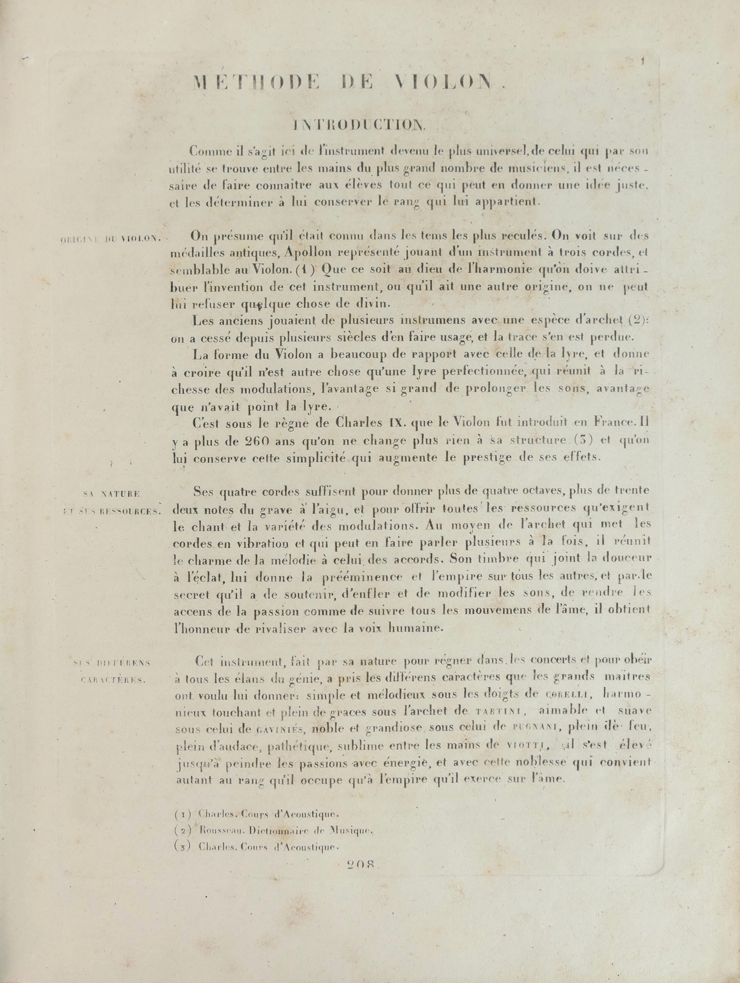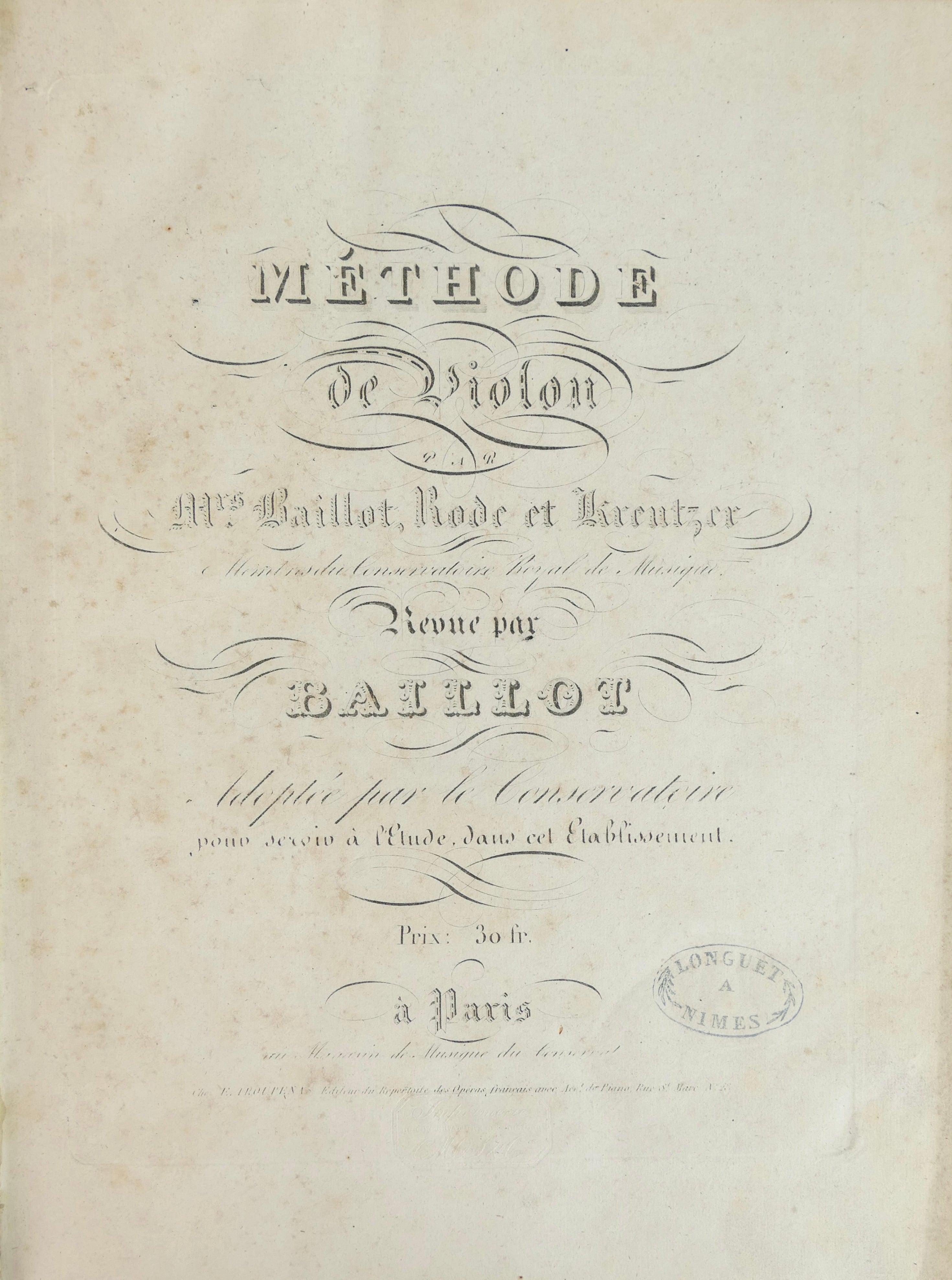 "Created as the official violin method for Paris Conservatoire, collectively compiled by three important violinist-composers and faculty members. Largely consists of exercises for violin with bass-clef accompaniment, along with instructions on appoggiaturas, trills, and bowing. The text (about 15 pages) discusses how to hold the violin and bow, and discusses matters of expression, style, and taste." (Mark Katz, "The violin: a research and information guide," p. 134-135)