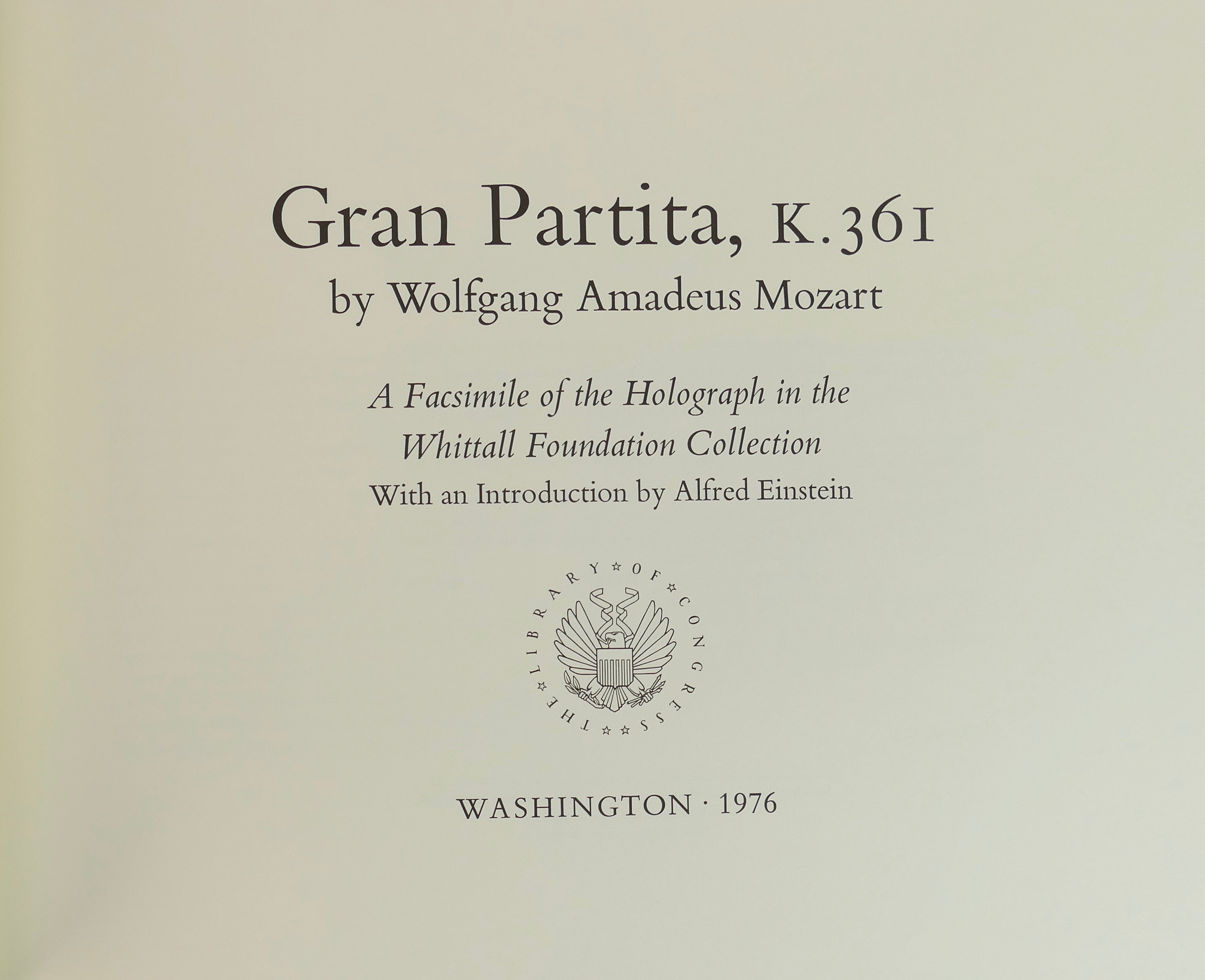 Mozart, Wolfgang Amadeus. (1756–1791) . Gran Partita, K.361 Serenade for 13 wind instruments in Bb Major. Washington, D.C. [Chicago]: Library of Congress. 1976/2008. With an Introduction by Alfred Einstein. xiv, 98 pp. Oblong, 35 x 27 cm. Reissue of Library of Congress 1976 facsimile edition using new full-color digital photography. The autograph score dates from c.1780.