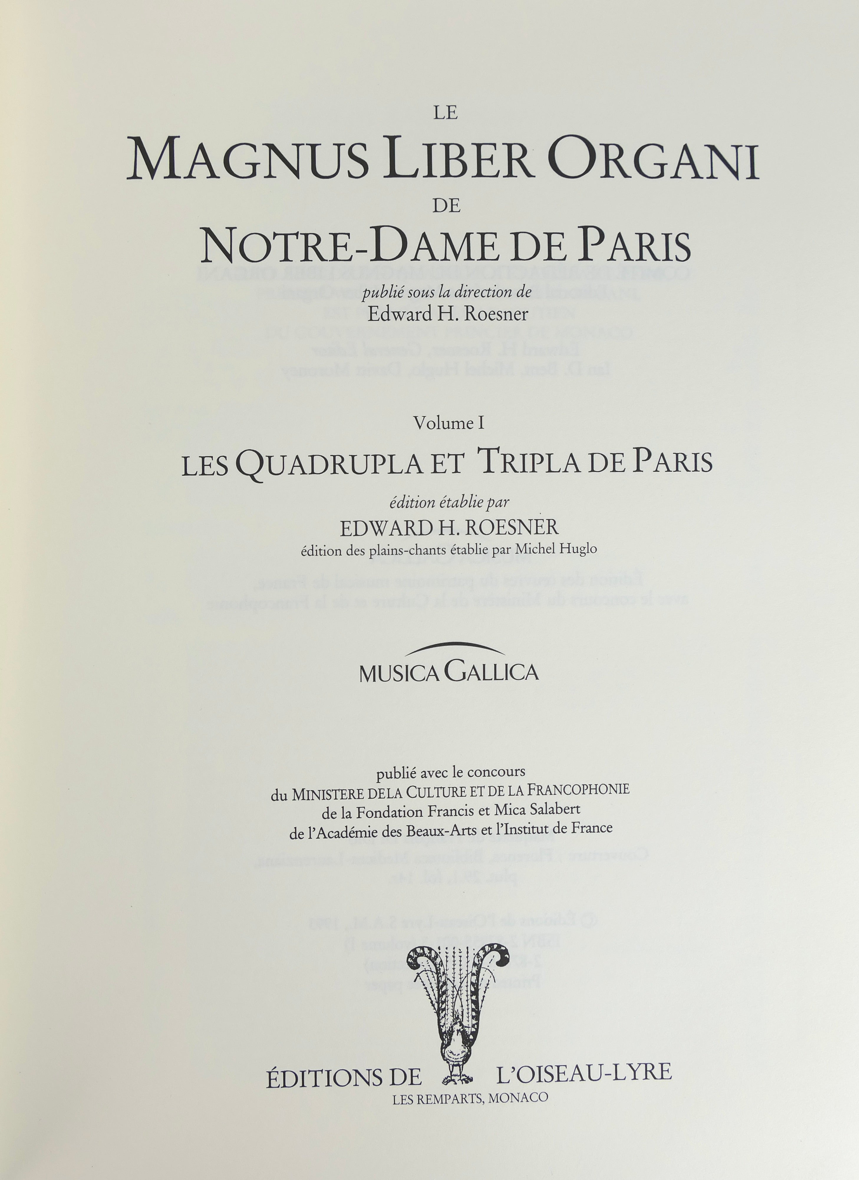 Volume I: Les quadrupla et tripla de Paris. Édition étabie par Edward H. Roesner. Édition des plains-chants établie par Michel Huglo. Le Magnus Liber Organi de Notre-Dame de Paris, I. Monaco, 1993. 4º. 358 pp. Critical edition of the 3- and 4-voice Notre Dame organa. Cloth.