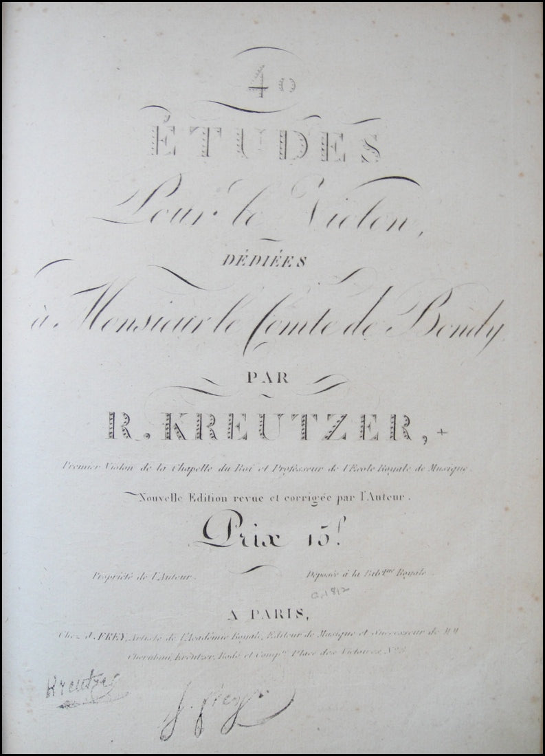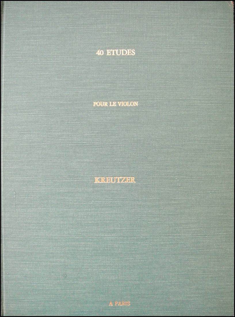 Kreutzer, Rodolphe. (1766-1831) . 40 Études ou Caprices pour le Violon . Paris: Chez J. Frey. [1812]. Second edition. Dédiées à Monsieur le Comte | de Bondy, | par | R. KREUTZER | Premier Violon de la Chapelle du Roi et Professeur de l'Ecole Royale de Musique. Nouvelle Edition revue et corrigée par l'Auteur. [2], 55, [1] p. of music. 34 cm. Engraved throughout. Bound in full green cloth, gilt lettering on spine and front board. In very fine condition throughout. RISM K 2393.