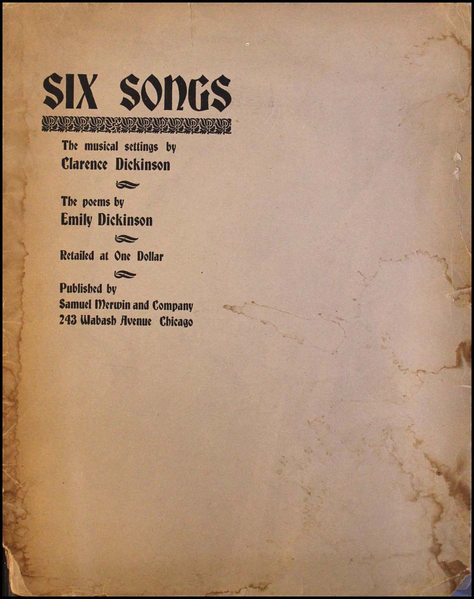 [Dickinson, Emily. (1830 - 1886)] Dickinson, Clarence. (1873 - 1969). Six Songs. Addressed to Mrs. Procter Smith. . Chicago: Samuel Merwin and Company. [1897]. First edition. Six Songs. The musical settings by Charles Dickinson. The poems by Emily Dickinson. Folio, title wrappers. 16 pp. Wrappers stained along spine and outer edge, lower wrapper corners chipped.