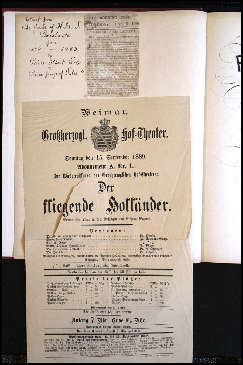Weimar. Grossherzogl hof=Theater. 15 September, 1889. Der Fliegende Holländer, featuring Hennig, Naumann-Gungl, Pichon, Szpiner and Schwarz. 23 x 37 cm. Partially torn.