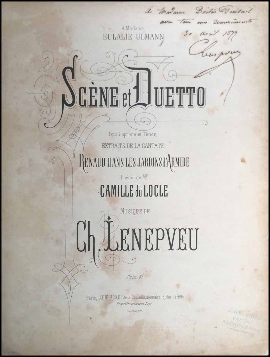 Lenepveu, Charles. (1840 - 1910). Scène et Duetto...Renaud dans les jardins d'Armide - SIGNED PRESENTATION COPY. Paris: J. Hielard. [Ca. 1875]. Upright folio. 8 pp. Lithographed [PN] 304. Front wrapper separated completely, small tape repairs lower edge and quite foxed, lacking rear wrapper, internally very good. SIGNED and inscribed on the front rapper upper left and dated 30 April, 1877.