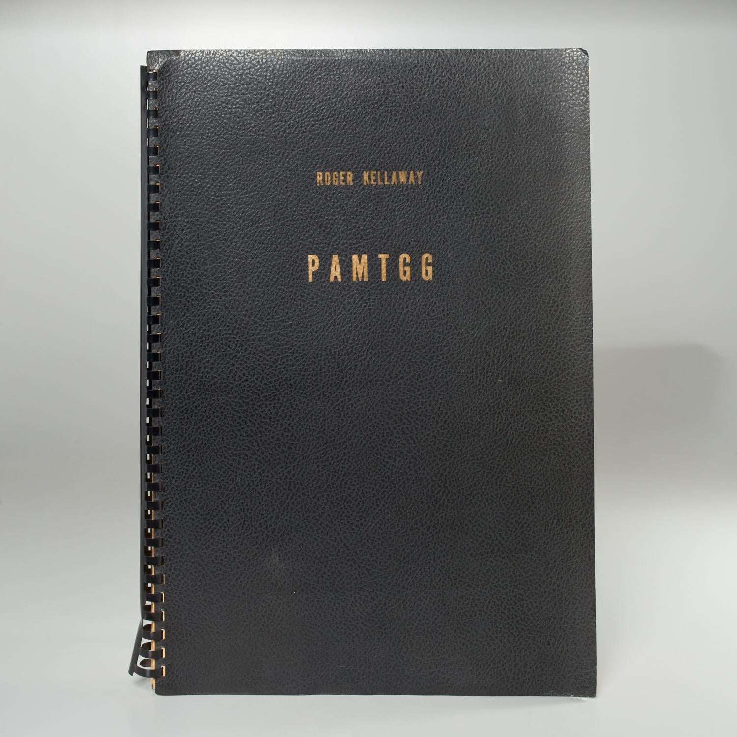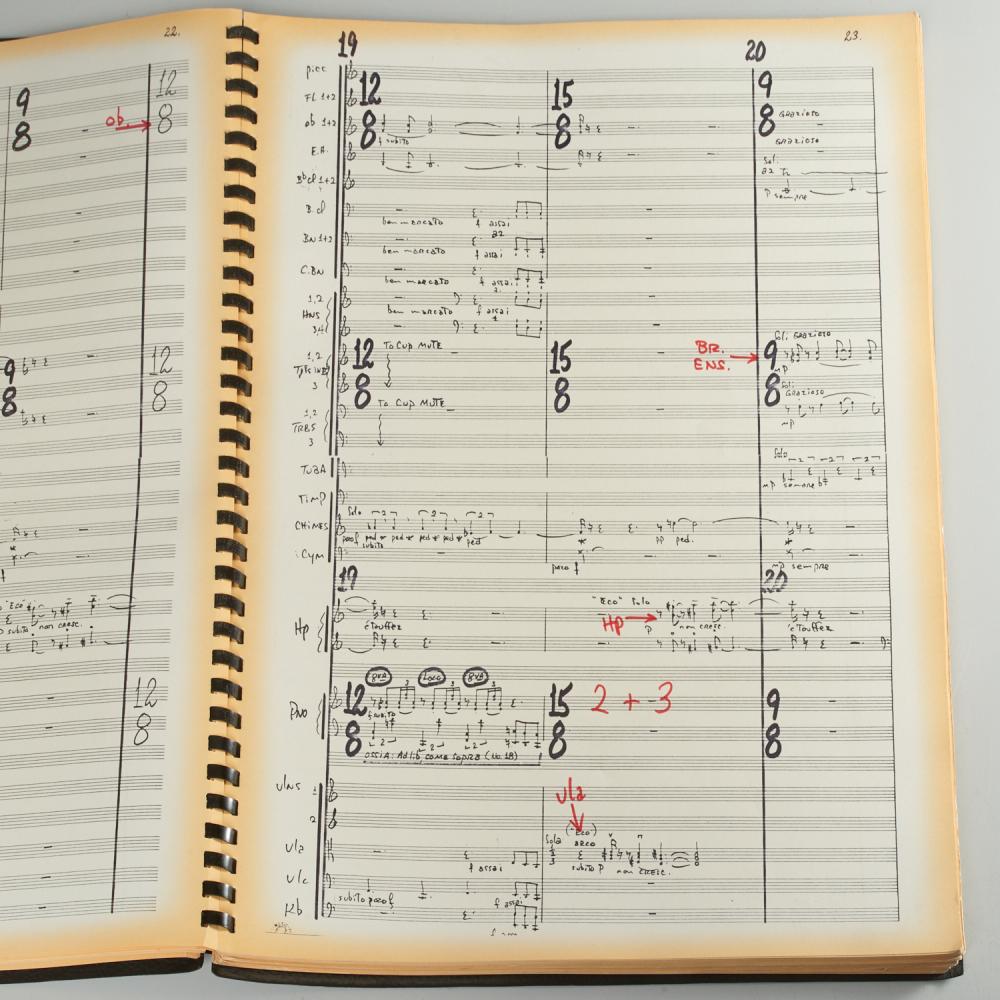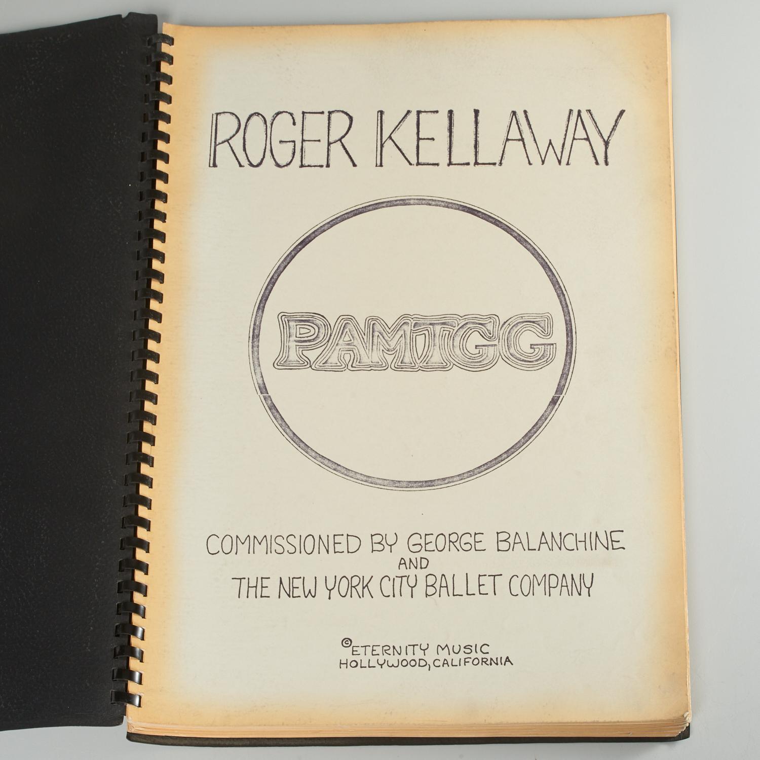 Large format published facsimile manuscript orchestral score for the ballet "PAMTGG" (Pan Am Makes the Going Great), inscribed by the composer to the father of American ballet in red ink above the printed dedication opposite the first page of music, "Dear George, I can never thank you  enough for giving me the opportunity to work with you.  It has been the purest and most rewarding experience of my life - working with you and for you. with love, Roger Kellaway." 137 pp, approximately 19 pages with minor annotations (musical notation, "Dancer --->" and other cues, instrumentation etc.) in same red ink. Textured black paper wrappers, plastic comb binding, 19.5"h x 14"w. Pages somewhat toned, plastic comb somewhat worn, overall very fine.