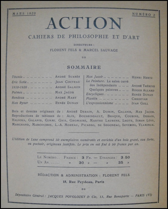 [Satie, Erik. (1866–1925)] [Cocteau, Jean. (1889–1963)]. Action. No. 2, Mars 1920. Paris: Jacques Povolozky. 1920. First edition. 8vo. 62 pp. Finely printed periodical publication in original thick brown wrappers, with contributions from Cocteau ("Eric Satie"), Suarès ("Titiana"), Max Jacob ("Poèmes"), Goll, Salmon, Allard, Hertz, Thérive, Dunan, Mary, Christian. Original woodcuts and lithographs by Derain, André Domin, Galanis, Max Jacob and reproductions of works by Picasso, Braque, Gris, Severini, Gromaire, Vlaminck. The issue in fine condition, with wrappers slightly darkened around edges.