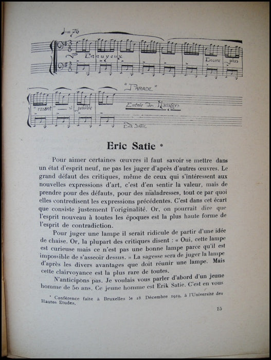 Cocteau's remarkable essay on Satie was originally given at a conference in Brussels on December 18, 1919, but was first published here. He urges the reader to take the music of Satie on its own terms ("to judge a lamp it would be ridiculous to begin with an idea of a chair") and gives an overview of Satie's life, the life of a "young man of 50 years old."