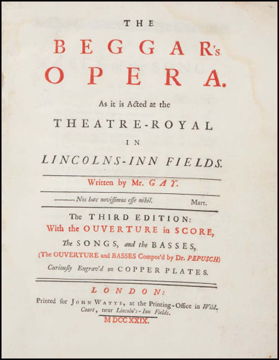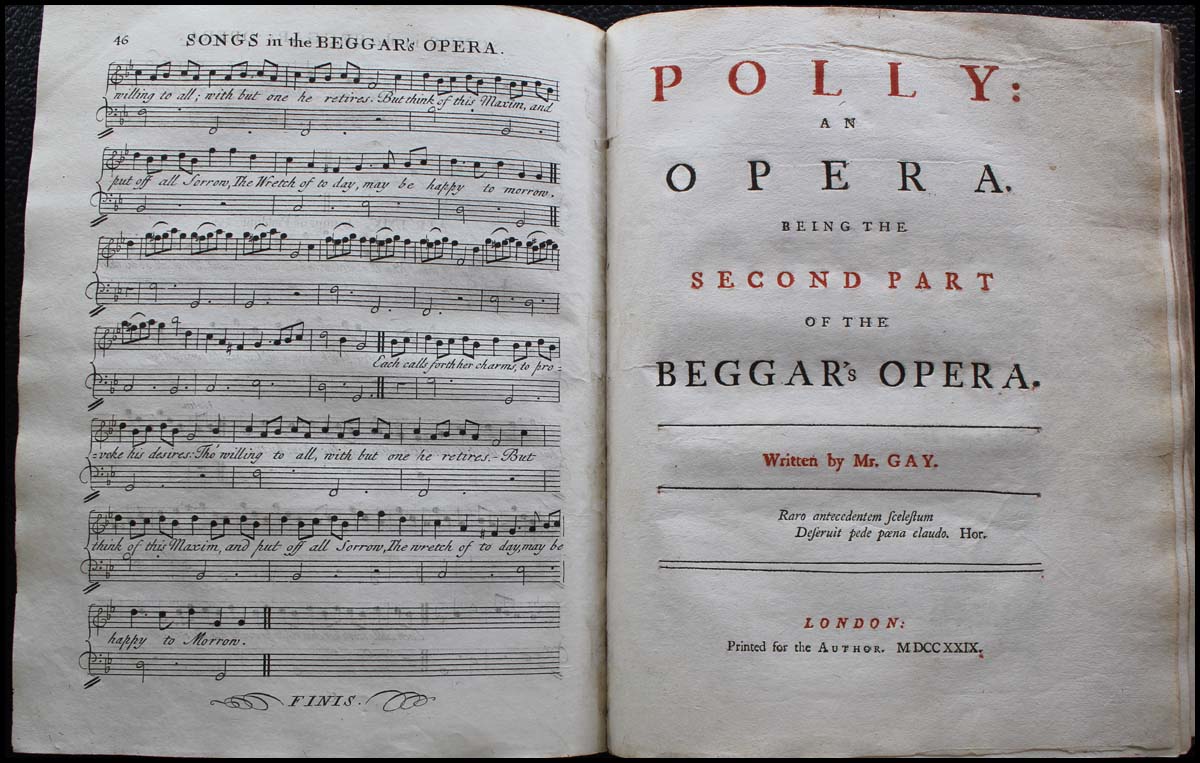 John Gay. Polly: An Opera Being the Second Part of The Beggar's Opera. London: Printed by the Author, 1729. First edition. BUC p. 801. RISM P1222.