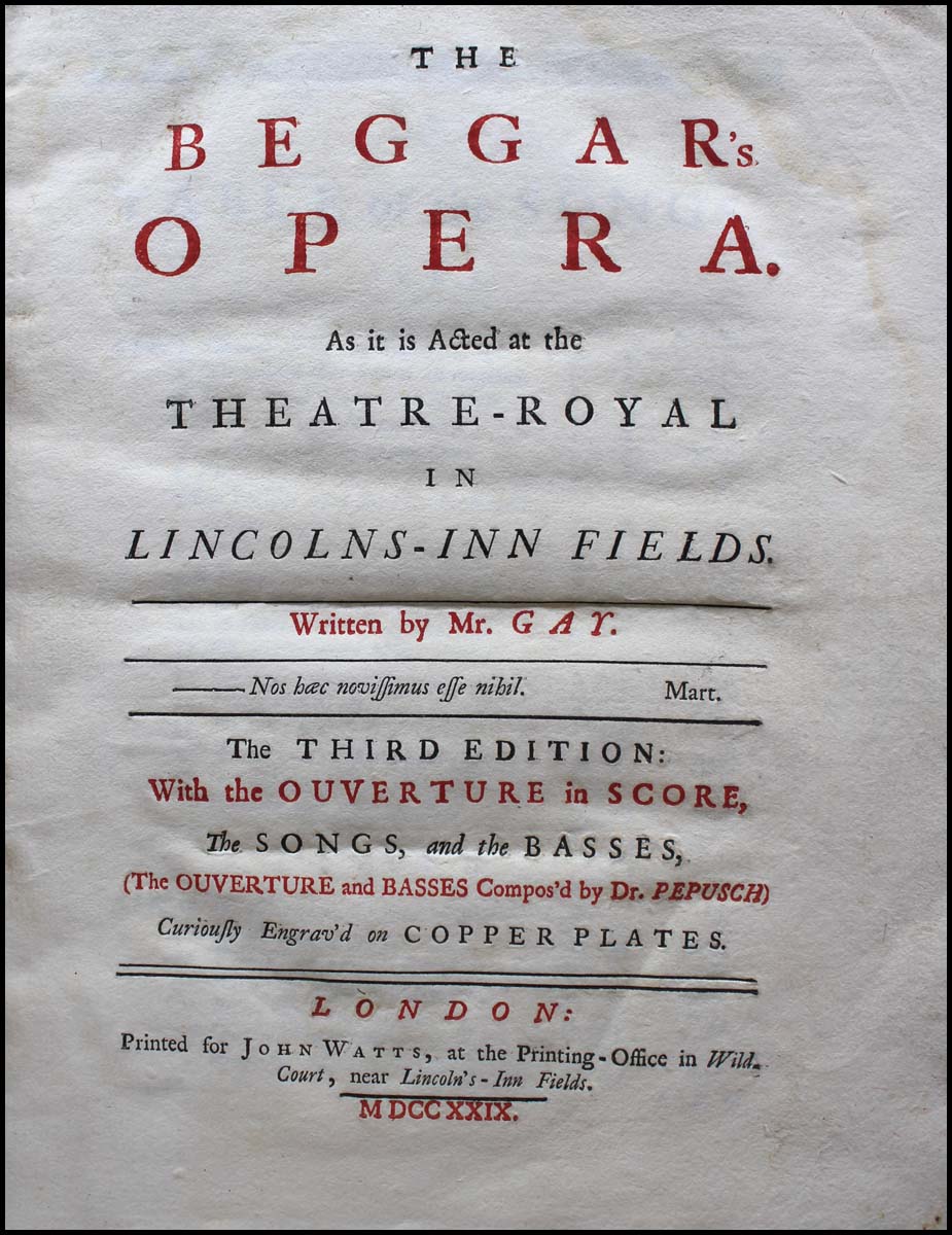[English Music] Gay, John. (1685-1732). The Beggar's Opera As it is Acted at the Theatre-Royal... [Bound with]: John Gay. Polly: An Opera Being the Second Part of The Beggar's Opera.. London: John Watts. 1729. The Beggar's Opera As it is Acted at the Theatre-Royal... London: John Watts, 1729. Third edition. BUC p. 96. RISM P1195.