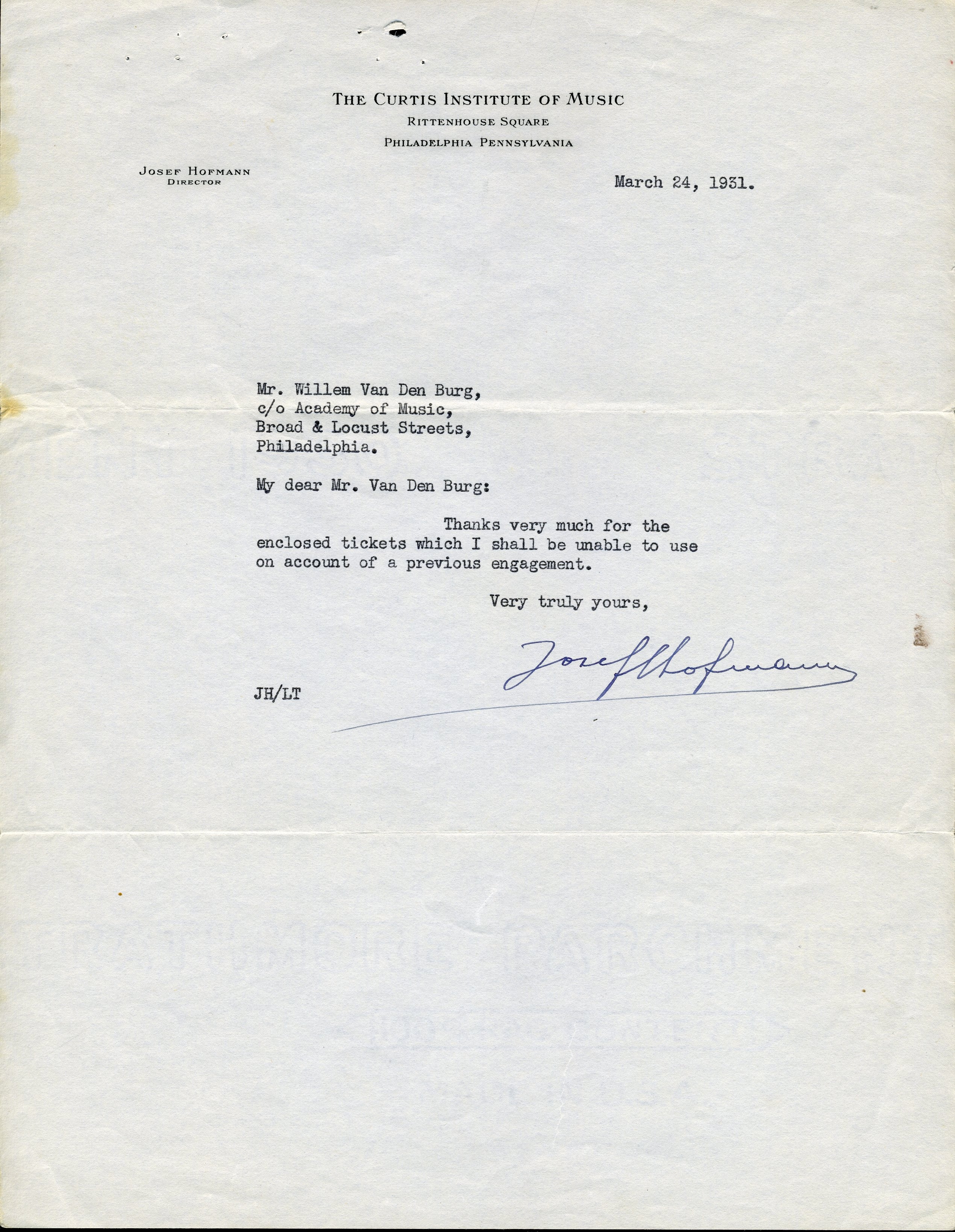 Hofmann, Josef. (1876-1957). TLS Returning Concert Tickets. Short typed letter on Curtis Institute letterhead signed by the great Polish American piano virtuoso, composer and teacher. "My dear Mr. Van Den Burg: Thanks very much for the enclosed tickets which I shall be unable to use on account of a previous engagement." Dated March 24, 1931. Mailing folds and small staple holes; otherwise in fine condition. 21.6 x 27.9 cm.