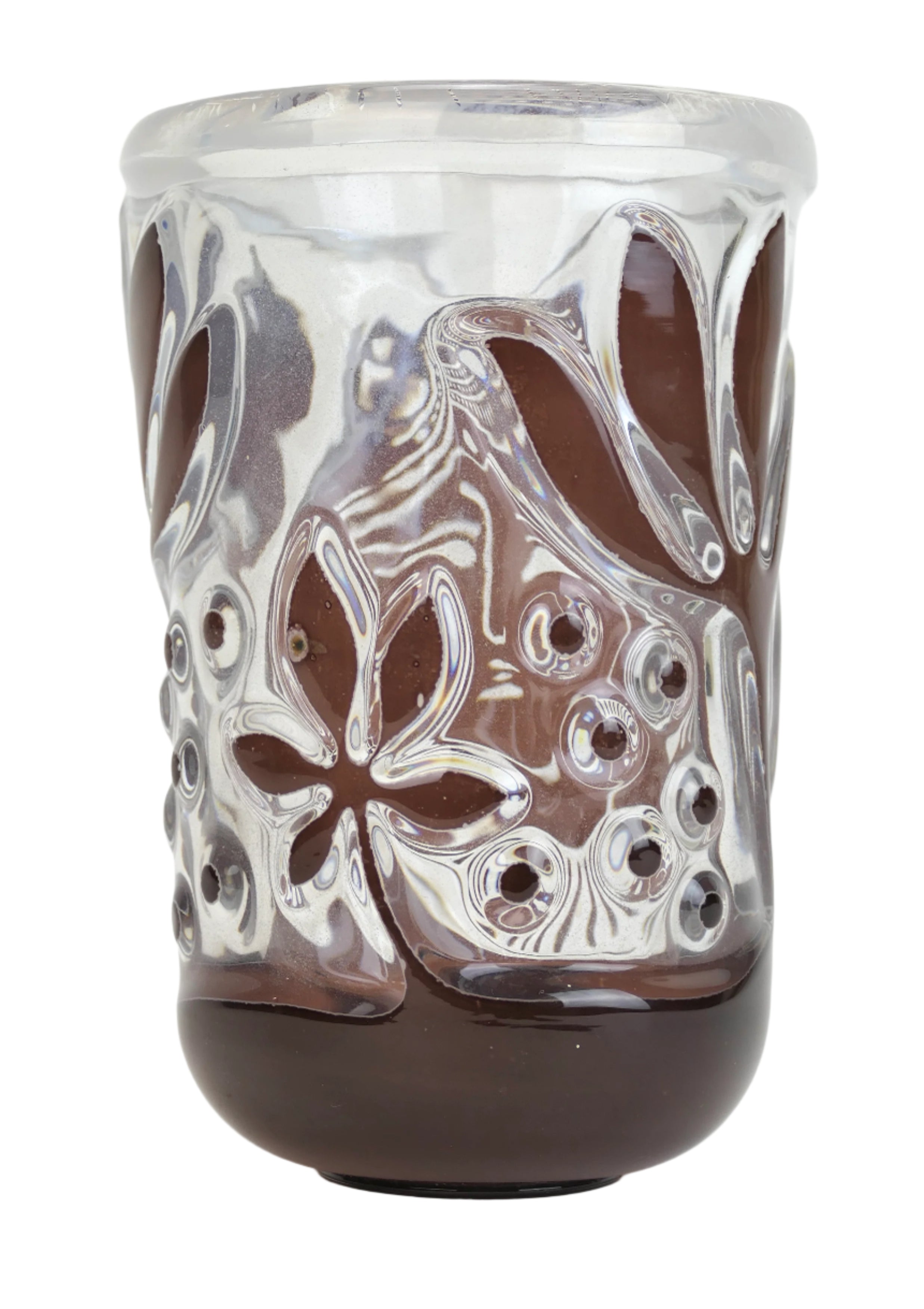 Glass vase designed by Edvin Oehrstroem for Orrefors Sweden. Crimson and clear glass, with depiction of a female figure, leaves and abstract figurations. This example signed to base: 'Orrefors Sweden 1945 / Nr. 51 E. Oehrstroem'. Slight clouding around the rim, a few stray marks, tiny chip to the bottom of base, overall in fine condition. 3.75 x 5.75 inches.
