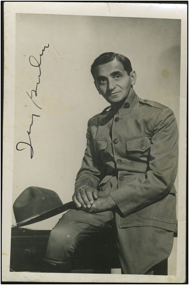 Berlin, Irving. (1888-1989). Signed Photograph. A vintage 4 X 6 inch photograph of Berlin in "This Is the Army," where he recreated a role he had played in his World War I hit "Yip! Yip! Yaphank." The great American songwriter is shown seated in a three quarter length pose wearing a uniform and holding his hat at his side. Signed in dark fountain pen ink with his name alone to a light area of the background.