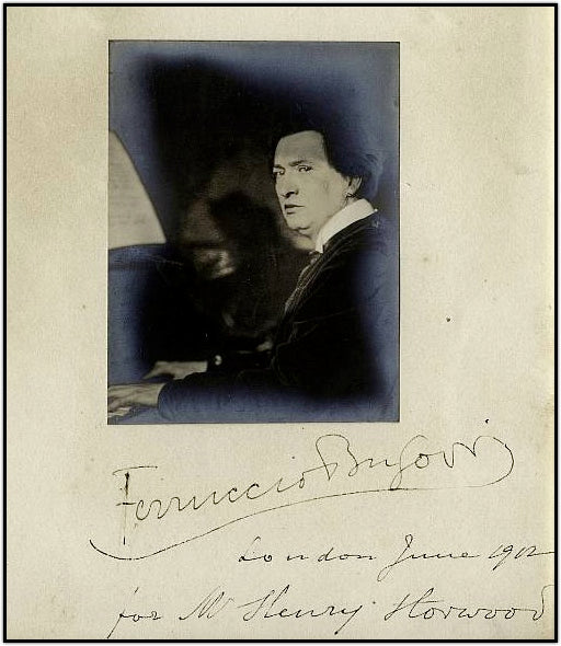 Five years before this photograph was signed, Busoni published his "Sketch of a New Musical Aesthetic." There, he lamented the musical "lawgivers" and predicted a musical revolution which would explode the traditional tonal rules, saying that "music was born free; and to win freedom is its destiny."