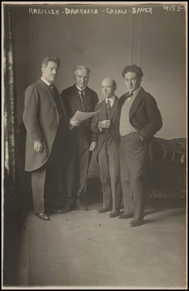 A remarkable photograph of Fritz Kreisler, Harold Bauer, Pablo Casals and Walter Damrosch at Carnegie Hall. Dated March 13, 1917. 15.5 X 10 cms. Irregularly trimmed, else fine.