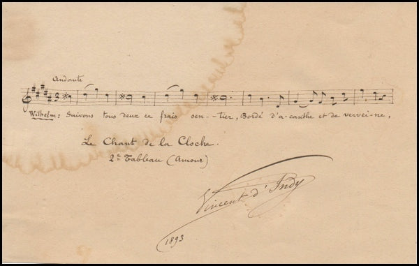 d'Indy, Vincent. (1851–1931). Autograph Musical Quotation, "Le Chant de la Cloche.". A superb AMQS from the great French musician - organist, timpanist, chorus master, conductor, author and teacher! Eight measures of music and text from the "2e Tableau (Amour)," signed in full and dated 1893. A light water stain extending from top left, but very presentable nevertheless.