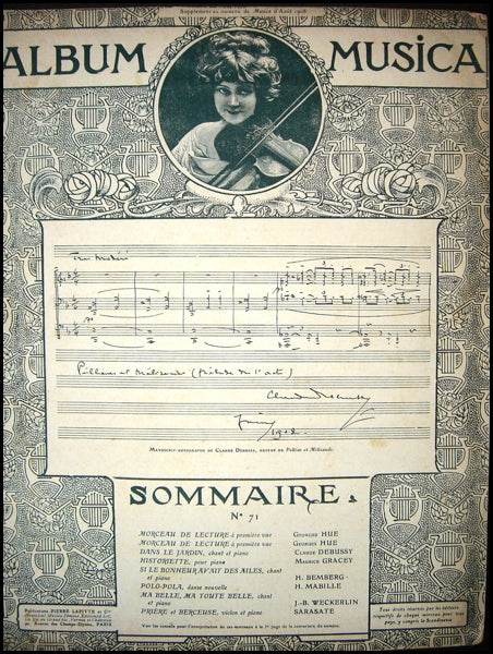 4to supplement to the magazine "Musica," with an attracitive manuscript facsimile by Debussy on the cover and including an early printing of Debussy's song "Dans le Jardin." Also includes: 2 "Morceau[x] de lecture à première vue" by G. Hue, "Historiette" by M. Gracey, "Si le bonheur avait des ailes" by H. Bemberg, "Polo-Pola" by H. Mabille, "Ma belle, ma toute belle" by J.-B. Weckerlin, "Prière et berceuse" by Sarasate. In very nice condition.