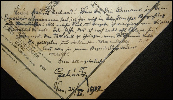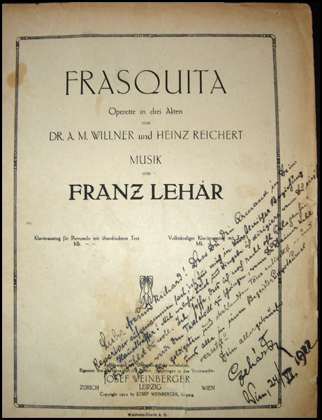 Lehar, Franz. (1870 - 1948). "Frasquita," inscribed to Richard Tauber. A rare copy of the operetta "Frasquita," inscribed by the composer 24 VII, 1922, the year of the first Vienna production, to the young operatic tenor, Richard Tauber. After first meeting Tauber in the context of this production, Lehar wrote six operettas expressly as vehicles for Tauber's artistry between 1925 and 1934. Each included numerous lyrical songs, duets and ensembles and each included what became known as the "Tauber-Lied." The present score was Tauber's working and well-worn copy of this work which first brought him to the attention of the composer and Lehar has penned a lengthy inscription ("Lieber Freund Richard!") on the title page. Though lacking the wrappers, torn through the inscription and well worn particularly at the spine, this is an important artifact from one of the most spectacular musical collaborations of the 20th century.