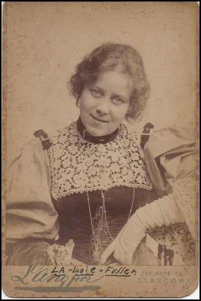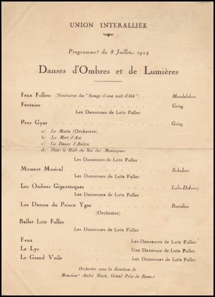 A superb original cabinet photograph and a very scarce program from the dance troupe of the modern dance and theatrical lighting pioneer who was the embodiment of the Art Nouveau movement. The 1924 program titled "Danses d'Ombres et de Lumieres," included works danced to music of Grieg, Mendelssohn, Schubert, Lalo-Debussy, and Borodine. 16.5 X 23 cm. In very good condition with a few creases. The photograph measures 10.5 X 16.5 cm.