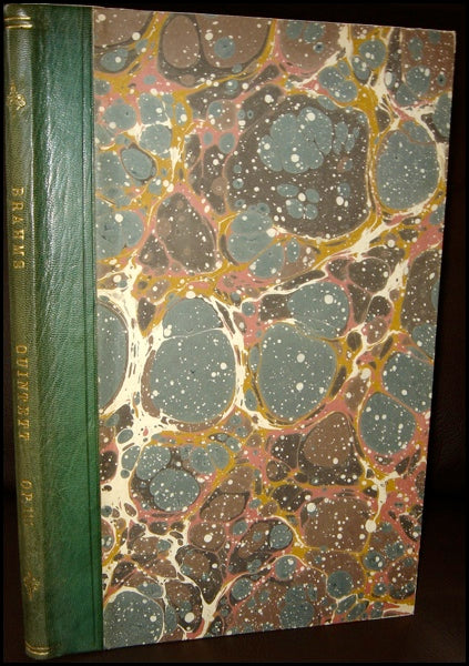 Brahms, Johannes. (1833–1897). Quintett für Clarinette (oder Bratsche), 2 Violinen, Bratsche und Violoncell...Op. 115. Partitur. Berlin: Simrock. 1892. First Edition. Score. 8vo. 58 pp., 1f. (blank). [PN] 9710. The two outerleaves rather soiled and repaired, otherwise a very good, bright copy. Beautifully bound in half green morocco with marbled boards. Hofmann 242-2; McCorkle 462-4. The parts were published at the same time, without a title page.