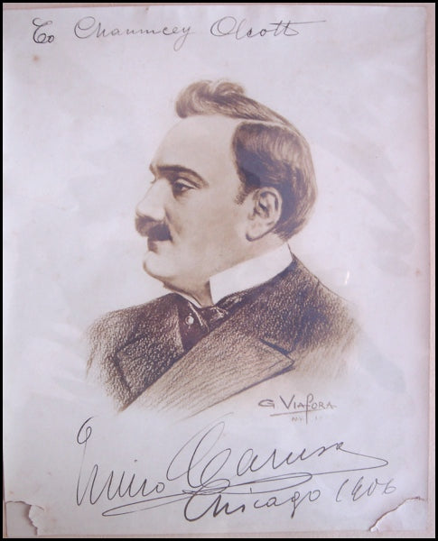 Caruso, Enrico. (1873-1921). Large Viafora Portrait Inscribed to Chauncey Olcott. A superb photograph of a Viafora portrait of the greatest of all tenors, boldly signed and inscribed by Caruso in 1906 to the composer, Chauncey Olcott (1858 - 1932). Olcott was a popular American stage actor, singer and songwriter, whose most famous songs include "My Wild Irish Rose" and "When Irish Eyes are Smiling."