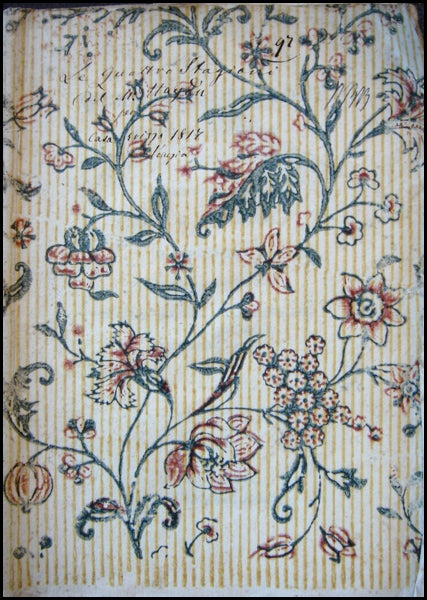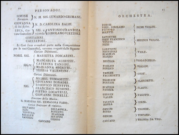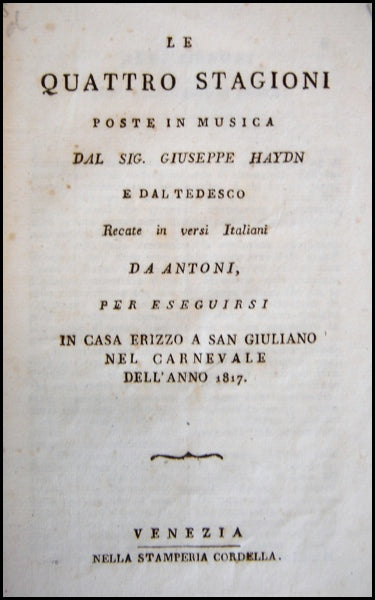 Le quattro stagioni poste in musica del sig. Giuseppe Haydn e dal tedesco recate in versi italiani da Antoni, per eseguirsi in casa Erizzo a San Giuliano nel Carnevale dell'anno 1817. 8vo. 56 pp. With a preface addressed "Alli Signori Veneti Dilettanti di Musica," a Preface by the translator, and including a list of the Personaggi and interpreters and a rare listing of the orchestral musicians. In beautiful original hand-stamped colored wrappers. With an 1817 inscription on the front wrapper, scattered light foxing and corner creases. Otherwise very fine.